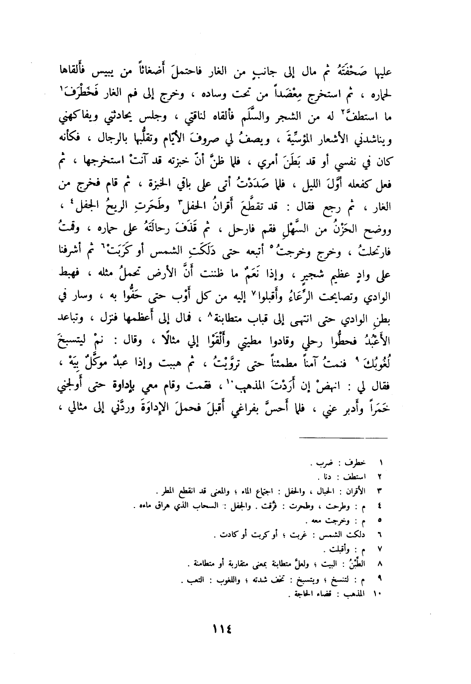 عليها صحفته ثم مال إلى جانب من الغار فاحتمل أضغاثا من يبيس فألقاها لحماره، ثم استخرج معضدا من تحت وساده، وخرج إلى فم الغار فخطرف [1] ما استطفّ [2] له من الشجر والسّلم فألقاه لناقتي، وجلس يحادثني ويفاكهني ويناشدني الأشعار المؤسيّة، ويصف لي صروف الأيّام وتقلّبها بالرجال، فكأنه كان في نفسي أو قد بطن أمري، فلما ظنّ أنّ خبزته قد آنت استخرجها، ثم فعل كفعله أوّل الليل، فلما صددت أتى على باقي الخبزة، ثم قام فخرج من الغار، ثم رجع فقال: قد تقطّع أقران الحفل [3] وطحرت الريح الجفل [4] ، ووضح الحزن من السّهل فقم فارحل، ثم قذف رحالته على حماره، وقمت فارتحلت، وخرج وخرجت [5] أتبعه حتى دلكت الشمس أو كربت [6] ثم أشرفنا على واد عظيم شجير، وإذا نعم ما ظننت أنّ الأرض تحمل مثله، فهبط الوادي وتصايحت الرّعاء وأقبلوا [7] إليه من كل أوب حتى حفّوا به، وسار في بطن الوادي حتى انتهى إلى قباب متطابنة [8] ، فمال إلى أعظمها فنزل، وتباعد الأعبد فحطّوا رحلي وقادوا مطيتي وألقوا إلي مثالا، وقال: نم ليتسبخ لغوبك [9] فنمت آمنا مطمئنا حتى تروّيت، ثم هببت وإذا عبد موكّل بيه، فقال لي: انهض إن أردت المذهب [10] ، فقمت وقام معي بإداوة حتى أولجني خمرا وأدبر عني، فلما أحسّ بفراغي أقبل فحمل الإداوة وردّني إلى مثالي،