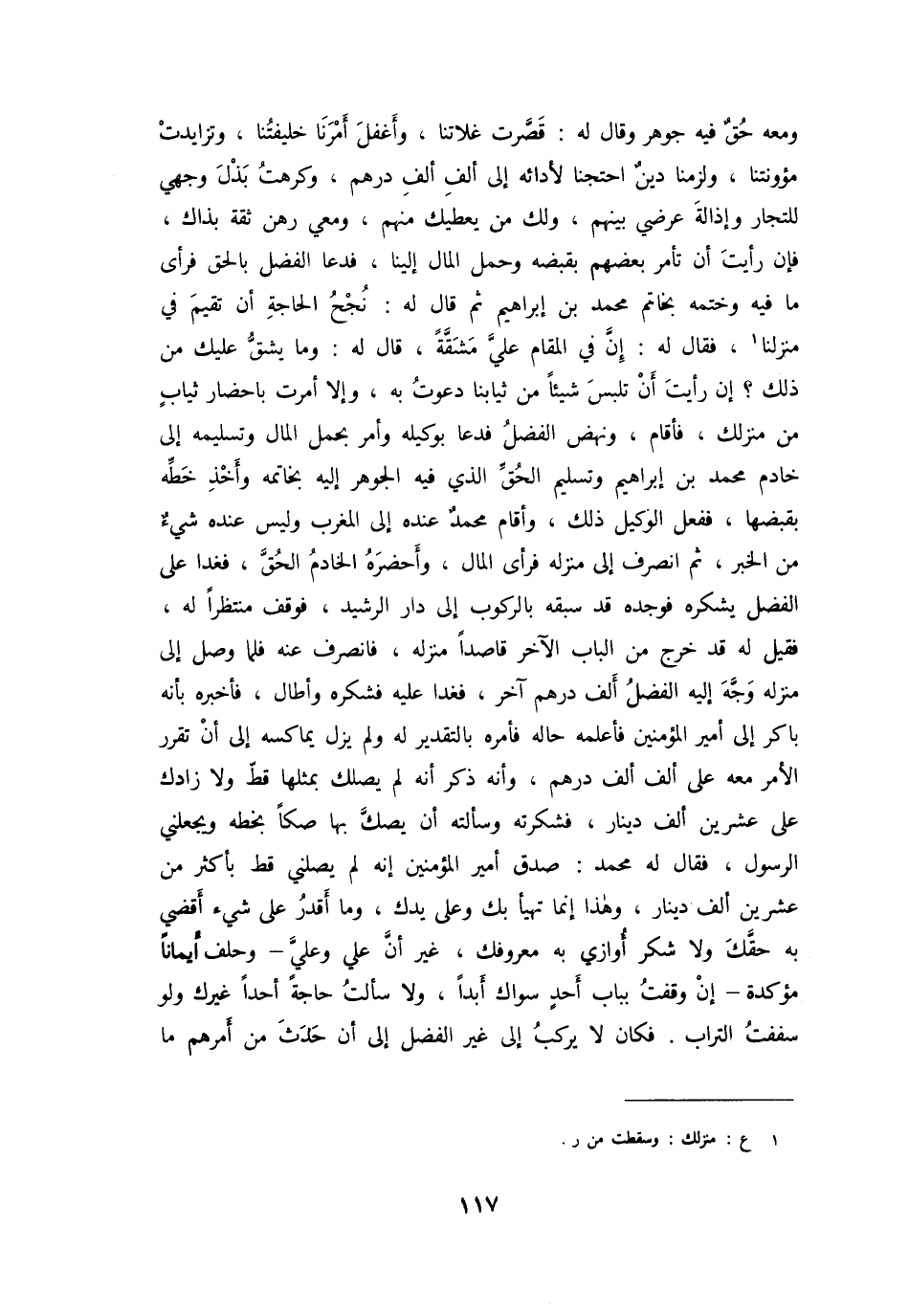 ومعه حق فيه جوهر وقال له: قصّرت غلاتنا، وأغفل أمرنا خليفتنا، وتزايدت مؤونتنا، ولزمنا دين احتجنا لأدائه إلى ألف ألف درهم، وكرهت بذل وجهي للتجار وإذالة عرضي بينهم، ولك من يعطيك منهم، ومعي رهن ثقة بذاك، فإن رأيت أن تأمر بعضهم بقبضه وحمل المال إلينا، فدعا الفضل بالحق فرأى ما فيه وختمه بخاتم محمد بن إبراهيم ثم قال له: نجح الحاجة أن تقيم في منزلنا [1] ، فقال له: إنّ في المقام عليّ مشقّة، قال له: وما يشقّ عليك من ذلك؟ إن رأيت أن تلبس شيئا من ثيابنا دعوت به، وإلا أمرت باحضار ثياب من منزلك، فأقام، ونهض الفضل فدعا بوكيله وأمر بحمل المال وتسليمه إلى خادم محمد بن إبراهيم وتسليم الحقّ الذي فيه الجوهر إليه بخاتمه وأخذ خطّه بقبضها، ففعل الوكيل ذلك، وأقام محمد عنده إلى المغرب وليس عنده شيء من الخبر، ثم انصرف إلى منزله فرأى المال، وأحضره الخادم الحقّ، فغدا على الفضل يشكره فوجده قد سبقه بالركوب إلى دار الرشيد، فوقف منتظرا له، فقيل له قد خرج من الباب الآخر قاصدا منزله، فانصرف عنه فلما وصل إلى منزله وجّه إليه الفضل ألف درهم آخر، فغدا عليه فشكره وأطال، فأخبره بأنه باكر إلى أمير المؤمنين فأعلمه حاله فأمره بالتقدير له ولم يزل يماكسه إلى أن تقرر الأمر معه على ألف ألف درهم، وأنه ذكر أنه لم يصلك بمثلها قطّ ولا زادك على عشرين ألف دينار، فشكرته وسألته أن يصكّ بها صكا بخطه ويجعلني الرسول، فقال له محمد: صدق أمير المؤمنين إنه لم يصلني قط بأكثر من عشرين ألف دينار، وهذا إنما تهيأ بك وعلى يدك، وما أقدر على شيء أقضي به حقّك ولا شكر أوازي به معروفك، غير أنّ علي وعليّ- وحلف أيمانا مؤكدة- إن وقفت بباب أحد سواك أبدا، ولا سألت حاجة أحدا غيرك ولو سففت التراب. فكان لا يركب إلى غير الفضل إلى أن حدث من أمرهم ما