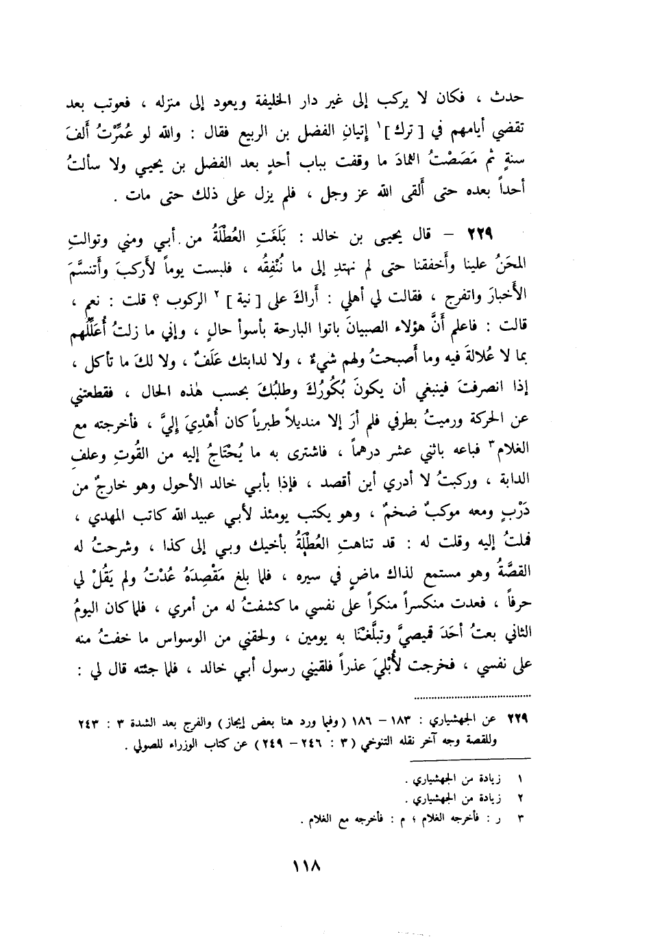 «229» - قال يحيى بن خالد: بلغت العطلة من أبي ومني وتوالت المحن علينا وأخفقنا حتى لم نهتد إلى ما ننفقه، فلبست يوما لأركب وأتنسّم الأخبار واتفرج، فقالت لي أهلي: أراك على [نية] [2] الركوب؟ قلت: نعم، قالت: فاعلم أنّ هؤلاء الصبيان باتوا البارحة بأسوأ حال، وإني ما زلت أعلّلهم بما لا علالة فيه وما أصبحت ولهم شيء، ولا لدابتك علف، ولا لك ما تأكل، إذا انصرفت فينبغي أن يكون بكورك وطلبك بحسب هذه الحال، فقطعتني عن الحركة ورميت بطرفي فلم أر إلا منديلا طبريا كان أهدي إليّ، فأخرجته مع الغلام [3] فباعه باثني عشر درهما، فاشترى به ما يحتاج إليه من القوت وعلف الدابة، وركبت لا أدري أين أقصد، فإذا بأبي خالد الأحول وهو خارج من درب ومعه موكب ضخم، وهو يكتب يومئذ لأبي عبيد الله كاتب المهدي، فملت إليه وقلت له: قد تناهت العطلة بأخيك وبي إلى كذا، وشرحت له القصّة وهو مستمع لذاك ماض في سيره، فلما بلغ مقصده عدت ولم يقل لي حرفا، فعدت منكسرا منكرا على نفسي ما كشفت له من أمري، فلما كان اليوم الثاني بعت أحد قميصيّ وتبلّغنا به يومين، ولحقني من الوسواس ما خفت منه على نفسي، فخرجت لأبلي عذرا فلقيني رسول أبي خالد، فلما جئته قال لي: