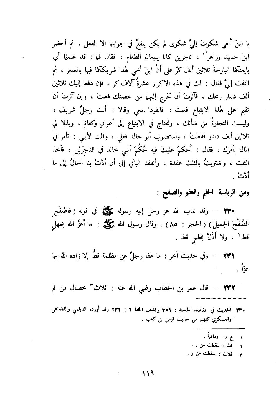 «230» - وقد ندب الله عز وجل إليه رسوله صلّى الله عليه وسلّم في قوله (فاصفح الصّفح الجميل) (الحجر: 85) . وقال رسول الله صلّى الله عليه وسلّم: ما أعزّ الله بجهل قط [2] ، ولا أذلّ بحلم قط.
