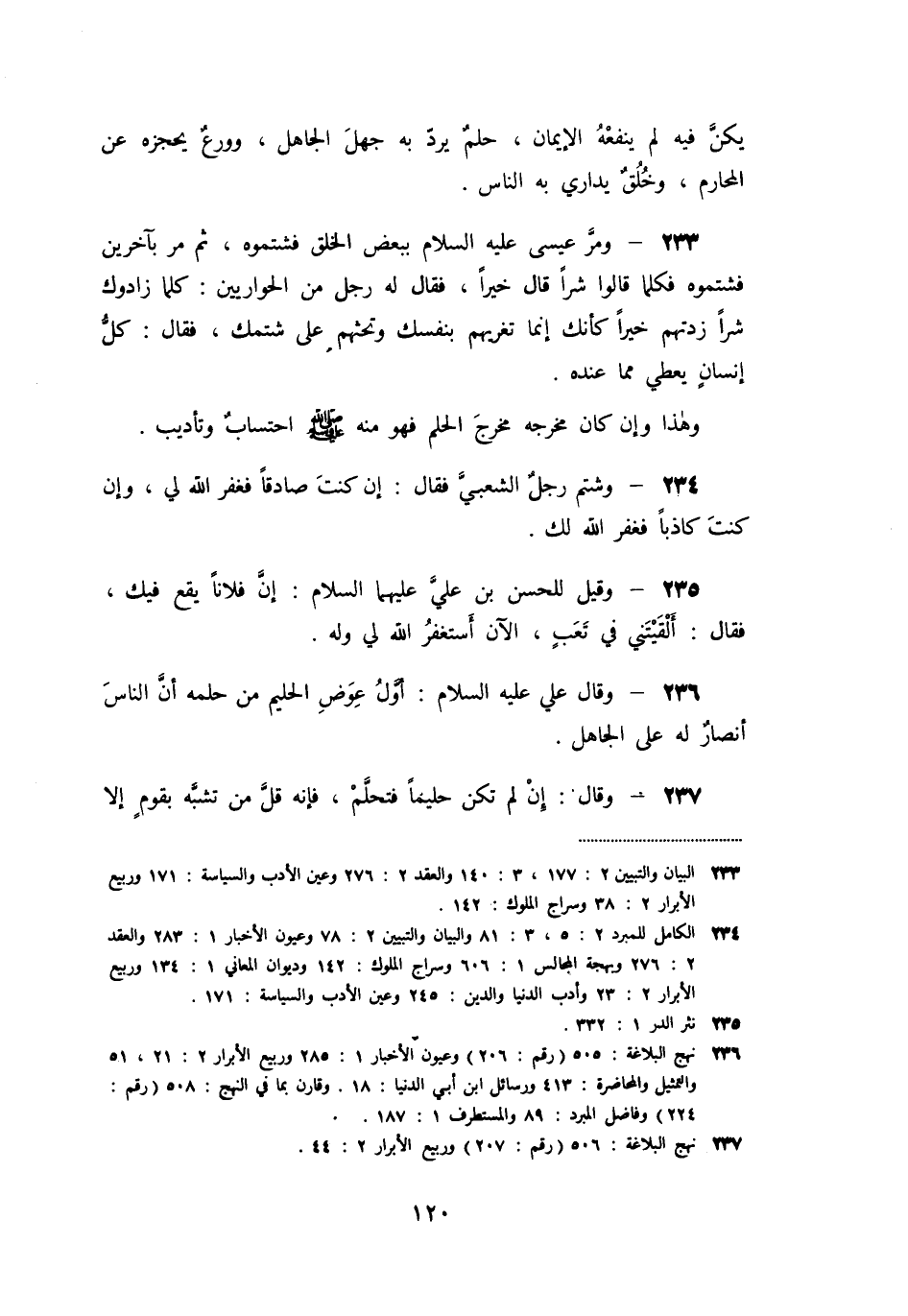 «233» - ومرّ عيسى عليه السلام ببعض الخلق فشتموه، ثم مر بآخرين فشتموه فكلما قالوا شرا قال خيرا، فقال له رجل من الحواريين: كلما زادوك شرا زدتهم خيرا كأنك إنما تغريهم بنفسك وتحثهم على شتمك، فقال: كلّ إنسان يعطي مما عنده.