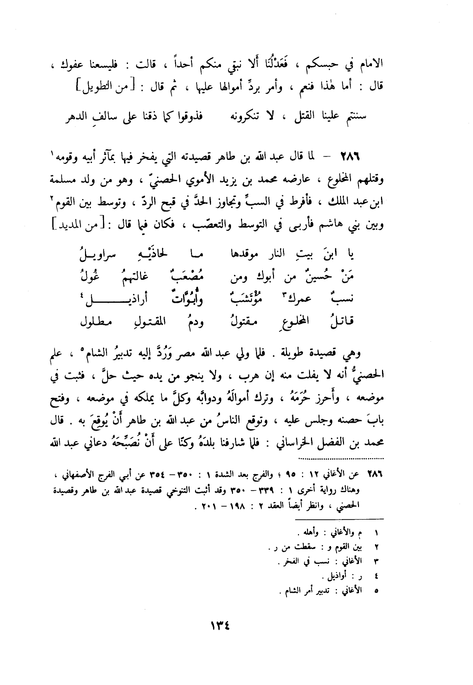 «286» - لما قال عبد الله بن طاهر قصيدته التي يفخر فيها بمآثر أبيه وقومه [1] وقتلهم المخلوع، عارضه محمد بن يزيد الأموي الحصنيّ، وهو من ولد مسلمة ابن عبد الملك، فأفرط في السبّ وتجاوز الحدّ في قبح الردّ، وتوسط بين القوم [2] وبين بني هاشم فأربى في التوسط والتعصّب، فكان فيما قال: [من المديد]