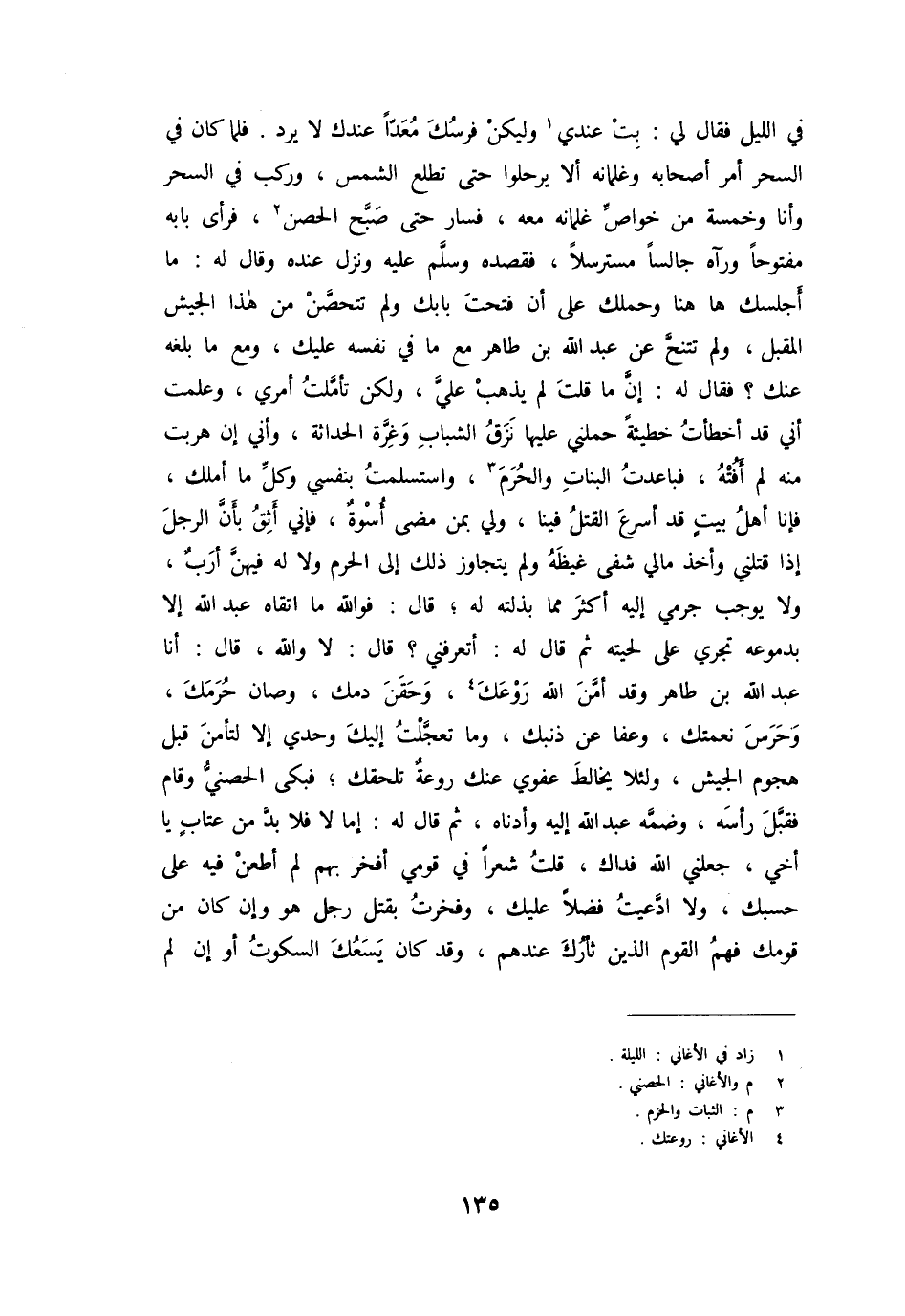 في الليل فقال لي: بت عندي [1] وليكن فرسك معدّا عندك لا يرد. فلما كان في السحر أمر أصحابه وغلمانه ألا يرحلوا حتى تطلع الشمس، وركب في السحر وأنا وخمسة من خواصّ غلمانه معه، فسار حتى صبّح الحصن [2] ، فرأى بابه مفتوحا ورآه جالسا مسترسلا، فقصده وسلّم عليه ونزل عنده وقال له: ما أجلسك ها هنا وحملك على أن فتحت بابك ولم تتحصّن من هذا الجيش المقبل، ولم تتنحّ عن عبد الله بن طاهر مع ما في نفسه عليك، ومع ما بلغه عنك؟ فقال له: إنّ ما قلت لم يذهب عليّ، ولكن تأمّلت أمري، وعلمت أني قد أخطأت خطيئة حملني عليها نزق الشباب وغرّة الحداثة، وأني إن هربت منه لم أفته، فباعدت البنات والحرم [3] ، واستسلمت بنفسي وكلّ ما أملك، فإنا أهل بيت قد أسرع القتل فينا، ولي بمن مضى أسوة، فإني أثق بأنّ الرجل إذا قتلني وأخذ مالي شفى غيظه ولم يتجاوز ذلك إلى الحرم ولا له فيهنّ أرب، ولا يوجب جرمي إليه أكثر مما بذلته له؛ قال: فوالله ما اتقاه عبد الله إلا بدموعه تجري على لحيته ثم قال له: أتعرفني؟ قال: لا والله، قال: أنا عبد الله بن طاهر وقد أمّن الله روعك [4] ، وحقن دمك، وصان حرمك، وحرس نعمتك، وعفا عن ذنبك، وما تعجّلت إليك وحدي إلا لتأمن قبل هجوم الجيش، ولئلا يخالط عفوي عنك روعة تلحقك؛ فبكى الحصنيّ وقام فقبّل رأسه، وضمّه عبد الله إليه وأدناه، ثم قال له: إما لا فلا بدّ من عتاب يا أخي، جعلني الله فداك، قلت شعرا في قومي أفخر بهم لم أطعن فيه على حسبك، ولا أدّعيت فضلا عليك، وفخرت بقتل رجل هو وإن كان من قومك فهم القوم الذين ثارك عندهم، وقد كان يسعك السكوت أو إن لم