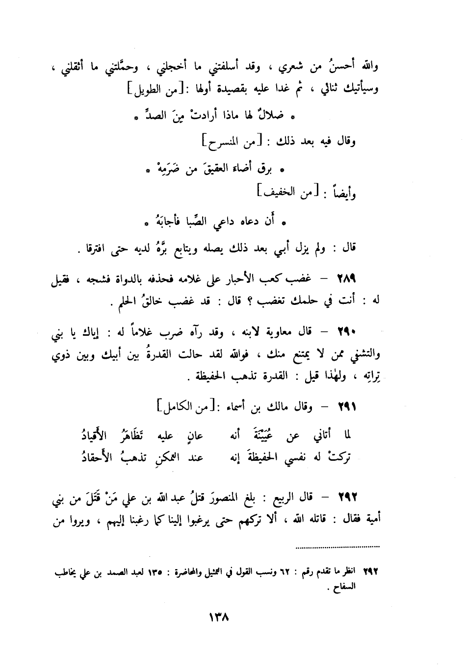 «292» - قال الربيع: بلغ المنصور قتل عبد الله بن علي من قتل من بني أمية فقال: قاتله الله، ألا تركهم حتى يرغبوا إلينا كما رغبنا إليهم، ويروا من