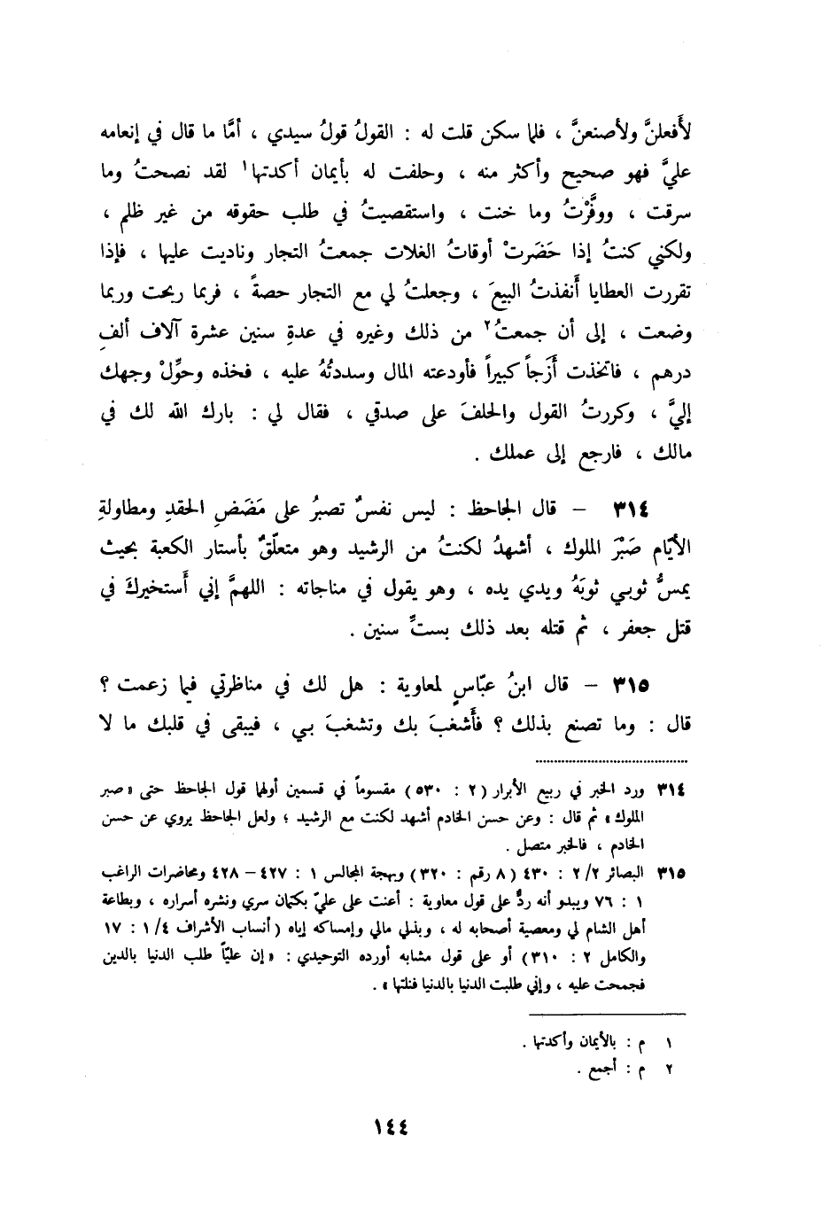 «314» - قال الجاحظ: ليس نفس تصبر على مضض الحقد ومطاولة الأيّام صبر الملوك، أشهد لكنت من الرشيد وهو متعلّق بأستار الكعبة بحيث يمسّ ثوبي ثوبه ويدي يده، وهو يقول في مناجاته: اللهمّ إني أستخيرك في قتل جعفر، ثم قتله بعد ذلك بستّ سنين.