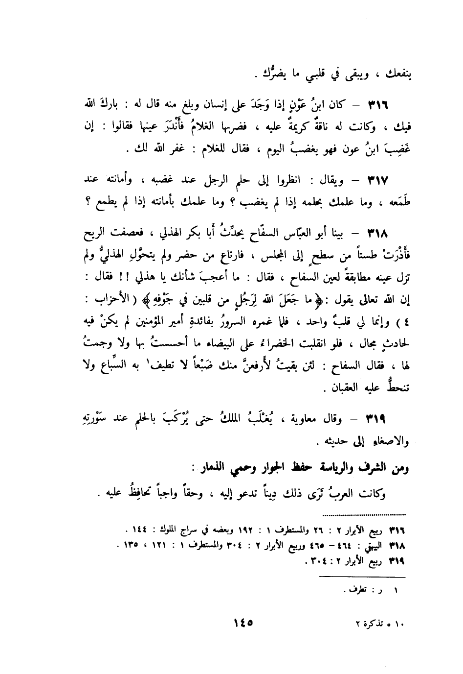 «316» - كان ابن عون إذا وجد على إنسان وبلغ منه قال له: بارك الله فيك، وكانت له ناقة كريمة عليه، فضربها الغلام فأندر عينها فقالوا: إن غضب ابن عون فهو يغضب اليوم، فقال للغلام: غفر الله لك.