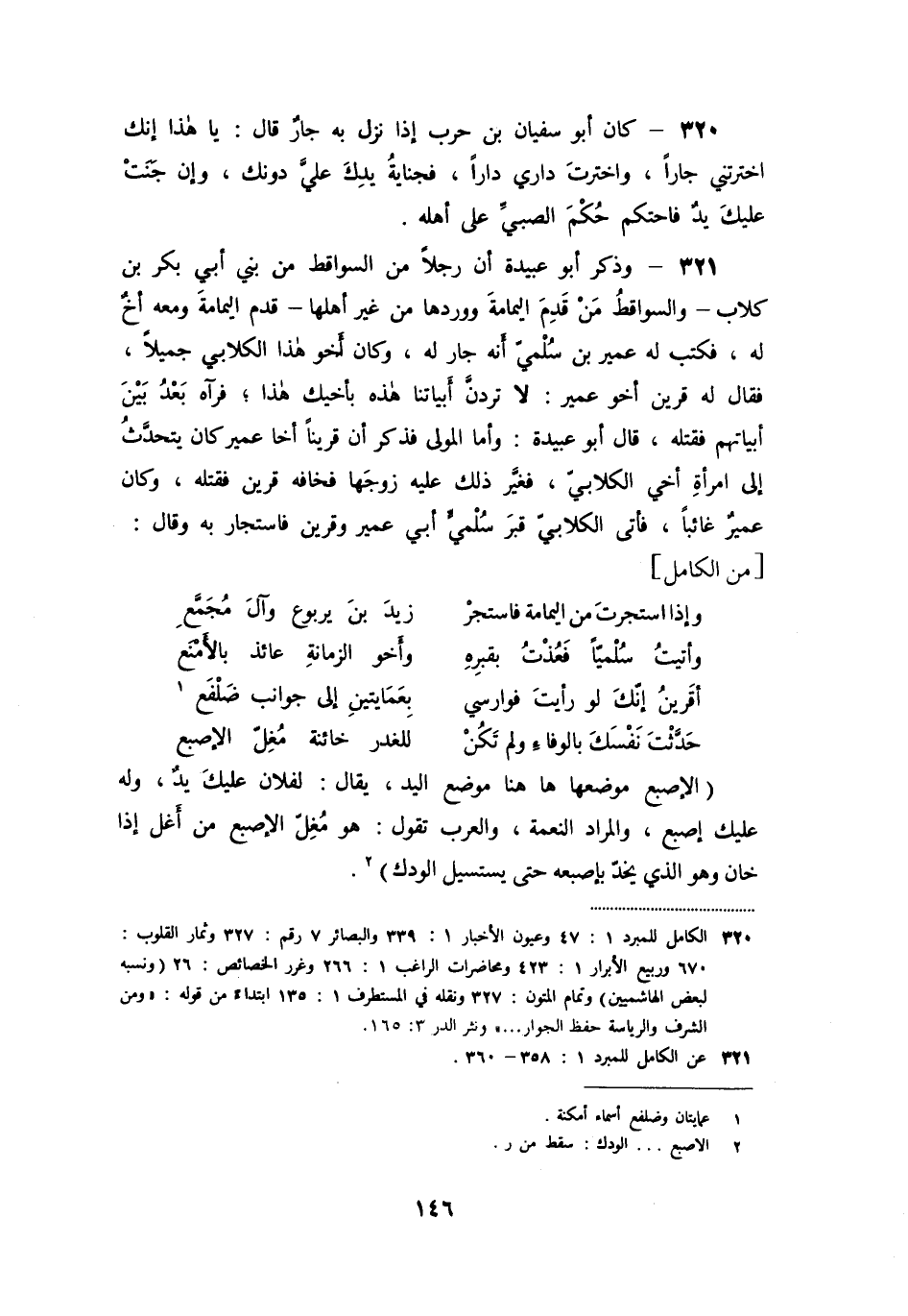 «320» - كان أبو سفيان بن حرب إذا نزل بن جار قال: يا هذا إنك اخترتني جارا، واخترت داري دارا، فجناية يدك عليّ دونك، وإن جنت عليك يد فاحتكم حكم الصبيّ على أهله.