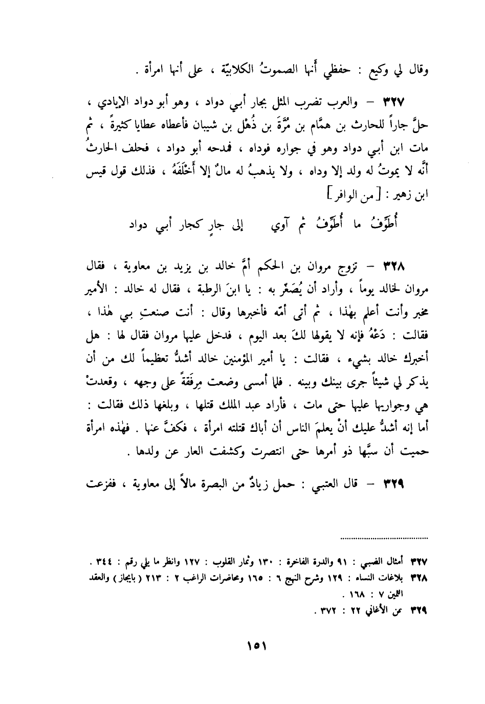 «328» - تزوج مروان بن الحكم أمّ خالد بن يزيد بن معاوية، فقال مروان لخالد يوما، وأراد أن يصغّر به: يا ابن الرطبة، فقال له خالد: الأمير مخبر وأنت أعلم بهذا، ثم أتى أمّه فأخبرها وقال: أنت صنعت بي هذا، فقالت: دعه فإنه لا يقولها لك بعد اليوم، فدخل عليها مروان فقال لها: هل أخبرك خالد بشيء، فقالت: يا أمير المؤمنين خالد أشدّ تعظيما لك من أن يذكر لي شيئا جرى بينك وبينه. فلما أمسى وضعت مرفقة على وجهه، وقعدت هي وجواريها عليها حتى مات، فأراد عبد الملك قتلها، وبلغها ذلك فقالت: