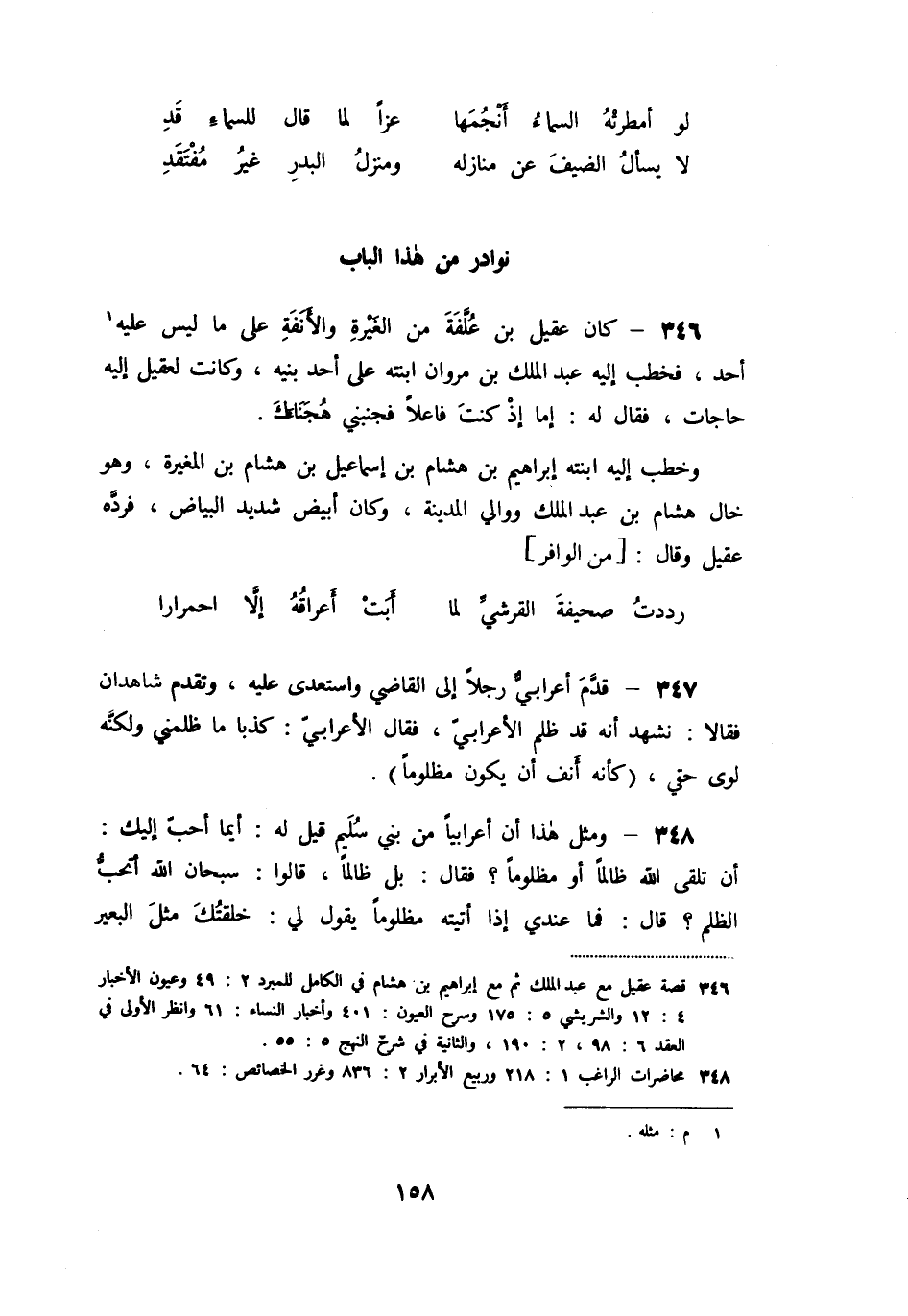 347- قدّم أعرابيّ رجلا إلى القاضي واستعدى عليه، وتقدم شاهدان فقالا: نشهد أنه قد ظلم الأعرابيّ، فقال الأعرابيّ: كذبا ما ظلمني ولكنّه لوى حقي، (كأنه أنف أن يكون مظلوما) .