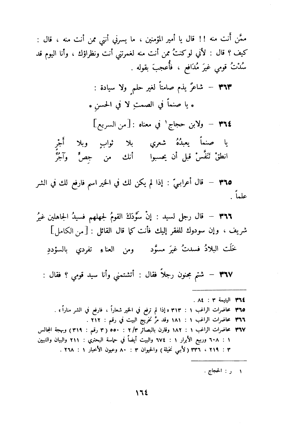 «366» - قال رجل لسيد: إن سوّدك القوم لجهلهم فسيد الجاهلين غير شريف، وإن سودوك للفقر إليك فأنت كما قال القائل: [من الكامل]