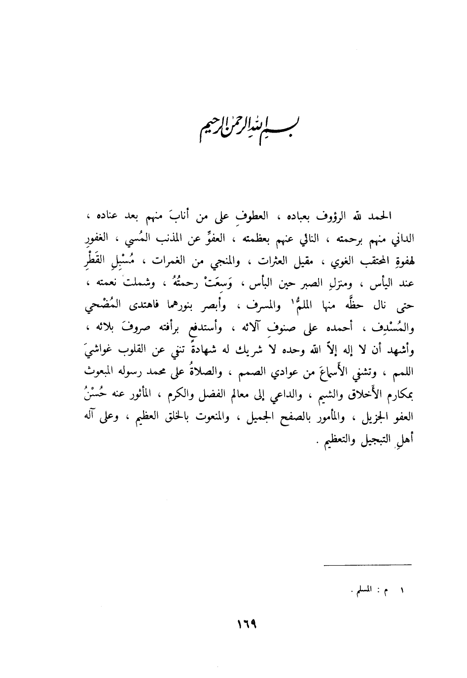 بسم الله الرّحمن الرّحيم الحمد لله الرؤوف بعباده، العطوف على من أناب منهم بعد عناده، الداني منهم برحمته، النائي عنهم بعظمته، العفوّ عن المذنب المسي، الغفور لهفوة المحتقب الغوي، مقيل العثرات، والمنجي من الغمرات، مسبل القطر عند اليأس، ومنزل الصبر حين البأس، وسعت رحمته، وشملت نعمته، حتى نال حظّه منها الملمّ [1] والمسرف، وأبصر بنورهما فاهتدى المضحي والمسدف، أحمده على صنوف آلائه، وأستدفع برأفته صروف بلائه، وأشهد أن لا إله إلّا الله وحده لا شريك له شهادة تنفي عن القلوب غواشي اللمم، وتشفي الأسماع من عوادي الصمم، والصلاة على محمد رسوله المبعوث بمكارم الأخلاق والشيم، والداعي إلى معالم الفضل والكرم، المأثور عنه حسن العفو الجزيل، والمأمور بالصفح الجميل، والمنعوت بالخلق العظيم، وعلى آله أهل التبجيل والتعظيم.