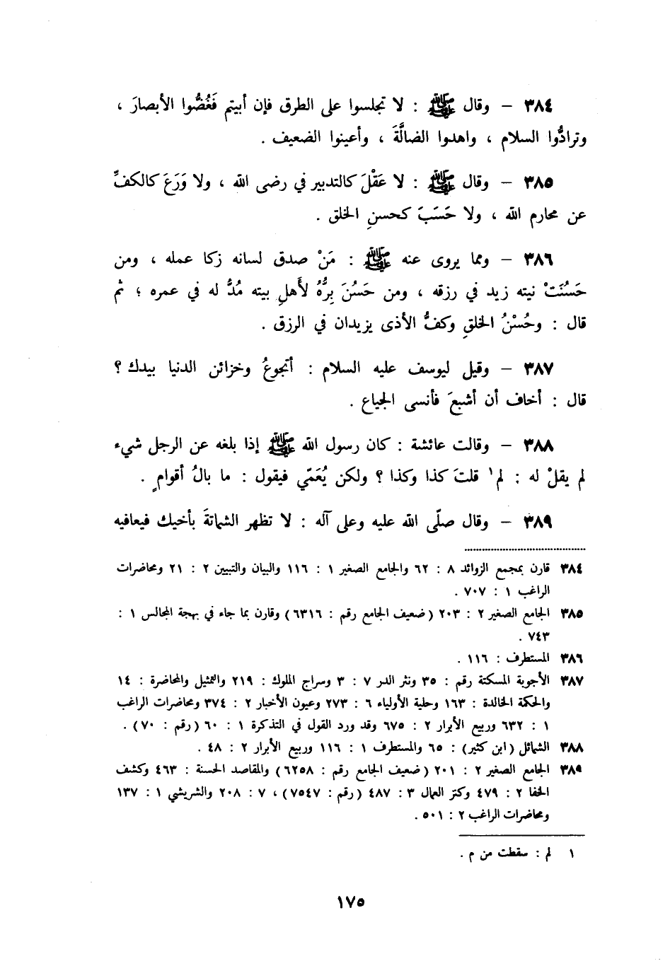 «384» - وقال صلّى الله عليه وسلّم: لا تجلسوا على الطرق فإن أبيتم فغضّوا الأبصار، وترادّوا السلام، واهدوا الضالّة، وأعينوا الضعيف.