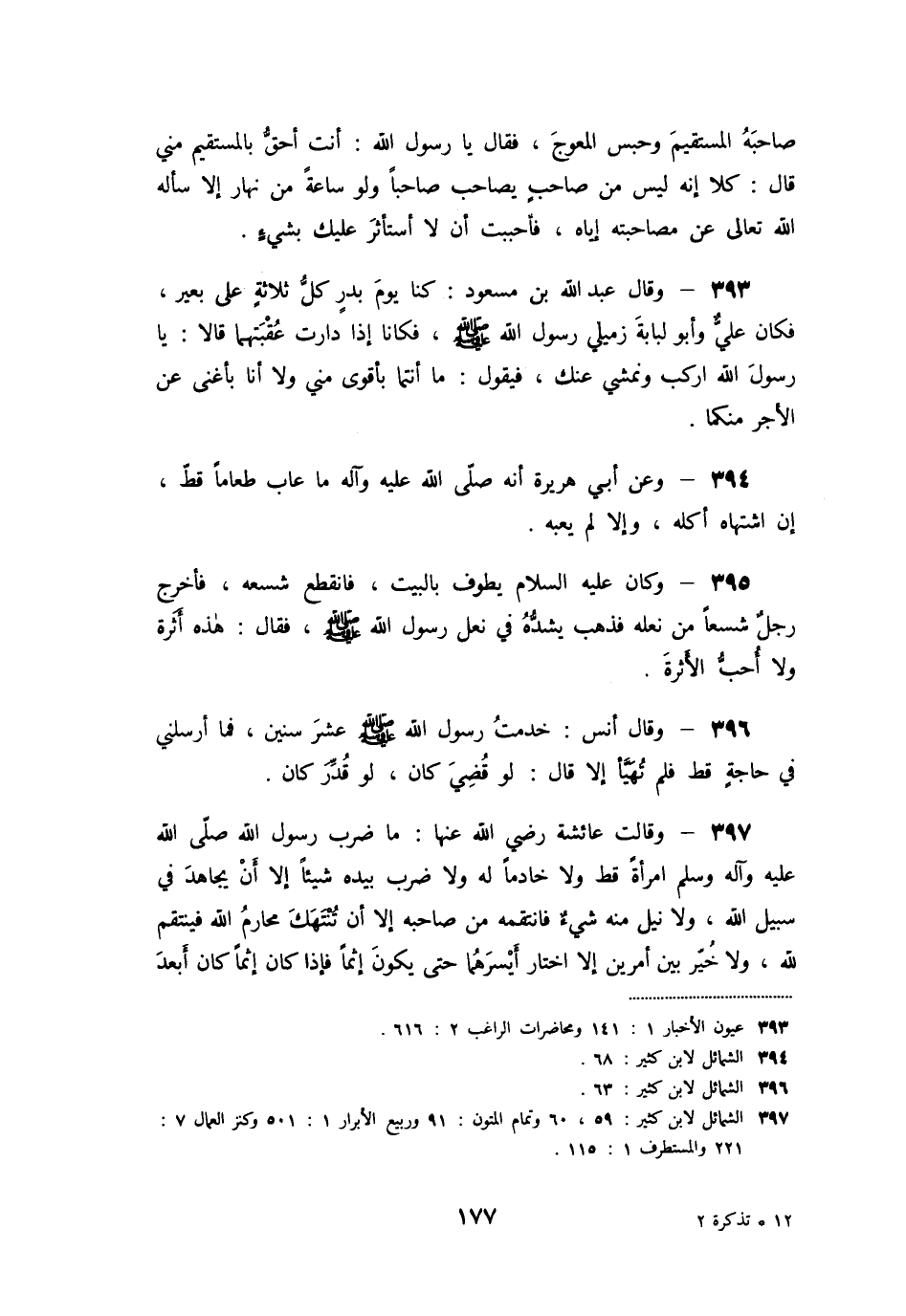 «397» - وقالت عائشة رضي الله عنها: ما ضرب رسول الله صلّى الله عليه وآله وسلّم امرأة قط ولا خادما له ولا ضرب بيده شيئا إلا أن يجاهد في سبيل الله، ولا نيل منه شيء فانتقمه من صاحبه إلا أن تنتهك محارم الله فينتقم لله، ولا خيّر بين أمرين إلا اختار أيسرهما حتى يكون إثما فإذا كان إثما كان أبعد
