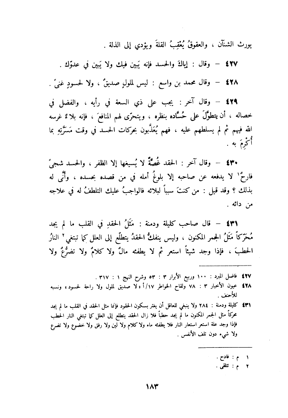 «431» - قال صاحب كليلة ودمنة: مثل الحقد في القلب ما لم يجد محركا مثل الجمر المكنون، وليس ينفكّ الحقد يتطلّع إلى العلل كما تبتغي [2] النار الحطب، فإذا وجد شيئا استعر ثم لا يطفئه مال ولا كلام ولا تضرّع ولا