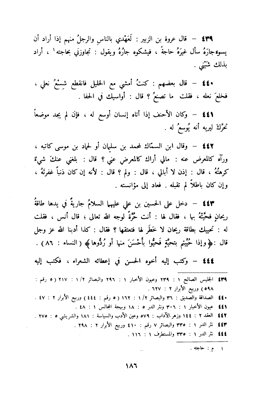 «443» - دخل على الحسين بن علي عليهما السلام جارية في يدها طاقة ريحان فحيّته بها، فقال لها: أنت حرّة لوجه الله تعالى؛ قال أنس، فقلت له: تحييك بطاقة ريحان لا خطر لها فتعتقها؟ فقال: كذا أدبنا الله عز وجل قال: وَإِذا حُيِّيتُمْ بِتَحِيَّةٍ فَحَيُّوا بِأَحْسَنَ مِنْها أَوْ رُدُّوها