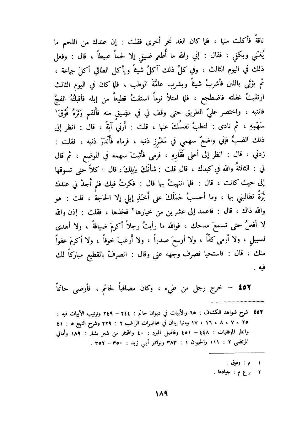 «452» - خرج رجل من طيء، وكان مصافيا لحاتم، فأوصى حاتما
