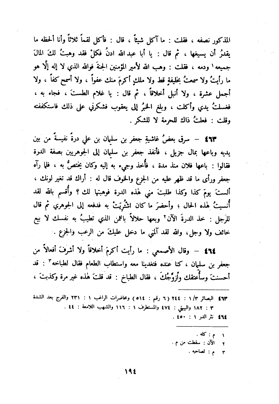 «464» - وقال الأصمعي: ما رأيت أكرم أخلاقا ولا أشرف أفعالا من جعفر بن سليمان، كنا عنده فتغدينا معه واستطاب الطعام فقال لطباخه [3] : قد أحسنت وسأعتقك وأزوّجك، فقال الطباخ: قد قلت هذه غير مرة وكذبت،
