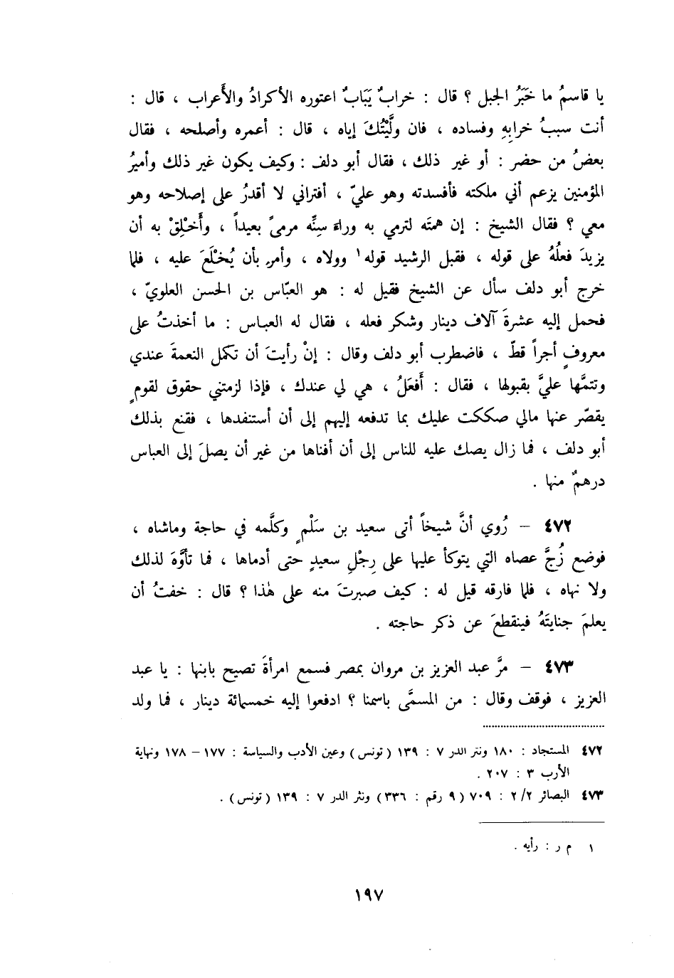 أنت سبب خرابه وفساده، فان ولّيتك إياه، قال: أعمره وأصلحه، فقال بعض من حضر: أو غير ذلك، فقال أبو دلف: وكيف يكون غير ذلك وأمير المؤمنين يزعم أني ملكته فأفسدته وهو عليّ، أفتراني لا أقدر على إصلاحه وهو معي؟ فقال الشيخ: إن همته لترمي به وراء سنّه مرمى بعيدا، وأخلق به أن يزيد فعله على قوله، فقبل الرشيد قوله [1] وولاه، وأمر بأن يخلع عليه، فلما خرج أبو دلف سأل عن الشيخ فقيل له: هو العبّاس بن الحسن العلويّ، فحمل إليه عشرة آلاف دينار وشكر فعله، فقال له العباس: ما أخذت على معروف أجرا قطّ، فاضطرب أبو دلف وقال: إن رأيت أن تكمل النعمة عندي وتتمّها عليّ بقبولها، فقال: أفعل، هي لي عندك، فإذا لزمتني حقوق لقوم يقصّر عنها مالي صككت عليك بما تدفعه إليهم إلى أن أستنفدها، فقنع بذلك أبو دلف، فما زال يصك عليه للناس إلى أن أفناها من غير أن يصل إلى العباس درهم منها.