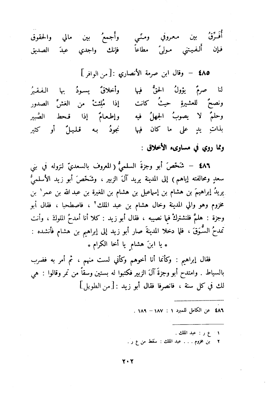 «486» - شخص أبو وجزة السلميّ (المعروف بالسعديّ لنزوله في بني سعد ومحالفته إياهم) إلى المدينة يريد آل الزبير، وشخص أبو زيد الأسلميّ يريد إبراهيم بن هشام بن إسماعيل بن هشام بن المغيرة بن عبد الله بن عمر [1] بن مخزوم وهو والي المدينة وخال هشام بن عبد الملك [2] ، فاصطحبا، فقال أبو وجزة: هلمّ فلنشترك فيما نصيبه، فقال أبو زيد: كلا أنا أمدح الملوك، وأنت تمدح السّوق، فلما دخلا المدينة صار أبو زيد إلى إبراهيم بن هشام فأنشده: