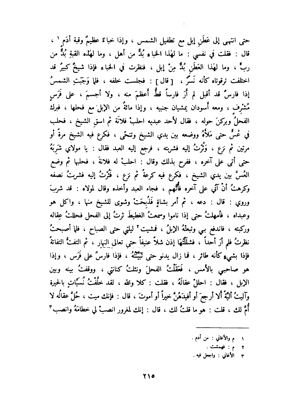 حتى انتهى إلى عطن إبل مع تطفيل الشمس، وإذا خباء عظيم وقبة أدم [1] ، قال: فقلت في نفسي: ما لهذا الخباء بدّ من أهل، وما لهذه القبة بدّ من ربّ، وما لهذا العطن بدّ من إبل، فنظرت في الخباء فإذا شيخ كبير قد اختلفت ترقوتاه كأنه نسر، [قال] : فجلست خلفه، فلما وجبت الشمس إذا فارس قد أقبل لم أر فارسا قطّ أعظم منه، ولا أجسم، على فرس مشرف، ومعه أسودان يمشيان جنبيه، وإذا مائة من الإبل مع فحلها، فبرك الفحل وبركن حوله، فقال لأحد عبديه احلب فلانة ثم اسق الشيخ، فحلب في عسّ حتى ملأه ووضعه بين يدي الشيخ وتنحّى، فكرع فيه الشيخ مرة أو مرتين ثم نزع، وثرت إليه فشربته، فرجع إليه العبد فقال: يا مولاي شربه حتى أتى على آخره، ففرح بذلك وقال: احلب له فلانة، فحلبها ثم وضع العسّ بين يدي الشيخ، فكرع فيه كرعة ثم نزع، فثرت إليه فشربت نصفه وكرهت أن آتي على آخره فأتّهم، فجاء العبد وأخذه وقال لمولاه: قد شرب وروي: قال: دعه، ثم أمر بشاة فذبحت وشوى للشيخ منها، واكل هو وعبداه، فأمهلت حتى إذا ناموا وسمعت الغطيط ثرت إلى الفحل فحللت عقاله وركبته، فاندفع بي وتبعته الإبل، فمشيت [2] ليلتي حتى الصباح، فلما أصبحت نظرت فلم أر أحدا، فشللتها إذن شلا عنيفا حتى تعالى النهار، ثم التفتّ التفاتة فإذا بشيء كأنه طائر، فما زال يدنو حتى تبيّنته، فإذا فارس على فرس، وإذا هو صاحبي بالأمس، فعقلت الفحل ونثلت كنانتي، ووقفت بينه وبين الإبل، فقال: احلل عقاله، فقلت: كلا والله، لقد خلّفت نسيّات بالحيرة وآليت أليّة ألا أرجع أو أفيدهنّ خيرا أو أموت، قال: فإنك ميت، حلّ عقاله لا أمّ لك، قلت: هو ما قلت لك، قال: إنك لمغرور انصب لي خطامه وانصب [3]