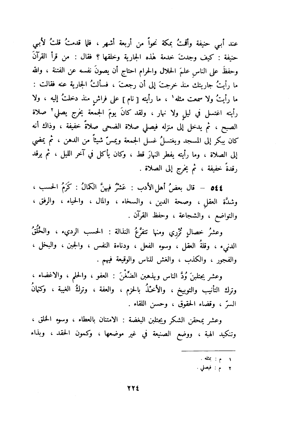 544- قال بعض أهل الأدب: عشر فيهنّ الكمال: كرم الحسب، وشدّة العقل، وصحة الدين، والسخاء، والمال، والحياء، والرفق، والتواضع، والشجاعة، وحفظ القرآن.