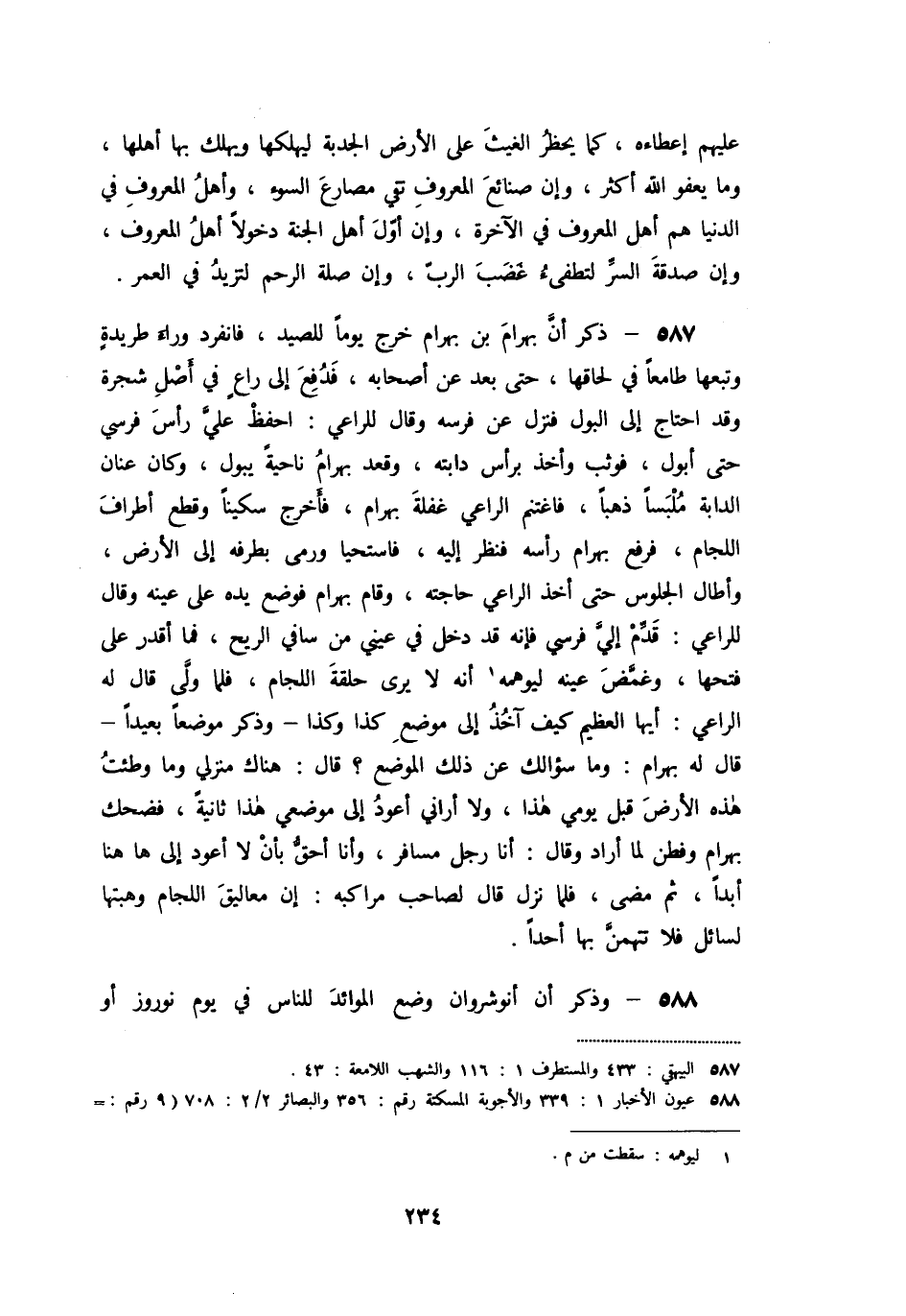 «587» - ذكر أنّ بهرام بن بهرام خرج يوما للصيد، فانفرد وراء طريدة وتبعها طامعا في لحاقها، حتى بعد عن أصحابه، فدفع إلى راع في أصل شجرة وقد احتاج إلى البول فنزل عن فرسه وقال للراعي: احفظ عليّ رأس فرسي حتى أبول، فوثب وأخذ برأس دابته، وقعد بهرام ناحية يبول، وكان عنان الدابة ملبسا ذهبا، فاغتنم الراعي غفلة بهرام، فأخرج سكينا وقطع أطراف اللجام، فرفع بهرام رأسه فنظر إليه، فاستحيا ورمى بطرفه إلى الأرض، وأطال الجلوس حتى أخذ الراعي حاجته، وقام بهرام فوضع يده على عينه وقال للراعي: قدّم إليّ فرسي فإنه قد دخل في عيني من سافي الريح، فما أقدر على فتحها، وغمّض عينه ليوهمه [1] أنه لا يرى حلقة اللجام، فلما ولّى قال له الراعي: أيها العظيم كيف آخذ إلى موضع كذا وكذا- وذكر موضعا بعيدا- قال له بهرام: وما سؤلك عن ذلك الموضع؟ قال: هناك منزلي وما وطئت هذه الأرض قبل يومي هذا، ولا أراني أعود إلى موضعي هذا ثانية، فضحك بهرام وفطن لما أراد وقال: أنا رجل مسافر، وأنا أحقّ بأن لا أعود إلى ها هنا أبدا، ثم مضى، فلما نزل قال لصاحب مراكبه: إن معاليق اللجام وهبتها لسائل فلا تتهمنّ بها أحدا.