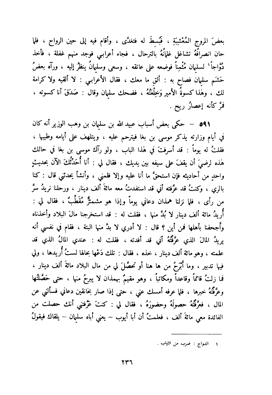 591- حكى بعض أسباب عبيد الله بن سليمان بن وهب الوزير أنه كان في أيام وزارته يذكر موسى بن بغا فيترحم عليه، ويتلهف على أيامه وطيبها، فقلت له يوما: قد أسرفت في هذا الباب، ولو رآك موسى بن بغا في حالك هذه لرضي أن يقف على سيفه بين يديك، فقال لي: أنا أحدّثك الآن بحديث واحد من أحاديثه فإن استحقّ ما أنا عليه وإلا فلمني، وأنشأ يحدثني قال: كنا بالري، وكنت قد عرّفته أني قد استفدت معه مائة ألف دينار، ورحلنا نريد سرّ من رأى، فلما نزلنا همذان دعاني يوما وإذا هو مشمئزّ مقطّب، فقال لي: