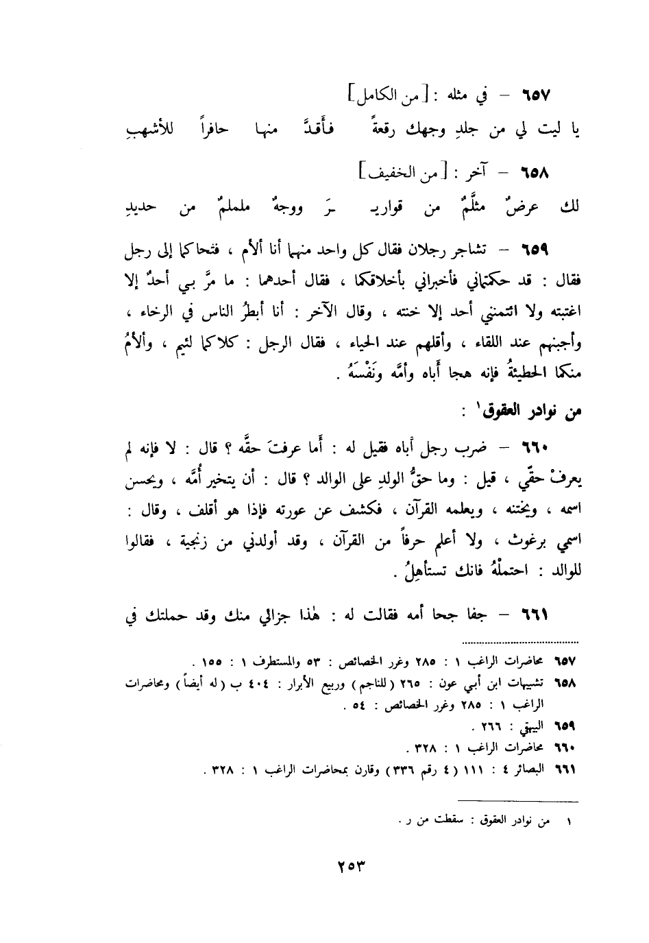 «660» - ضرب رجل أباه فقيل له: أما عرفت حقّه؟ قال: لا فإنه لم يعرف حقّي، قيل: وما حقّ الولد على الوالد؟ قال: أن يتخير أمّه، ويحسن اسمه، ويختنه، ويعلمه القرآن، فكشف عن عورته فإذا هو أقلف، وقال: