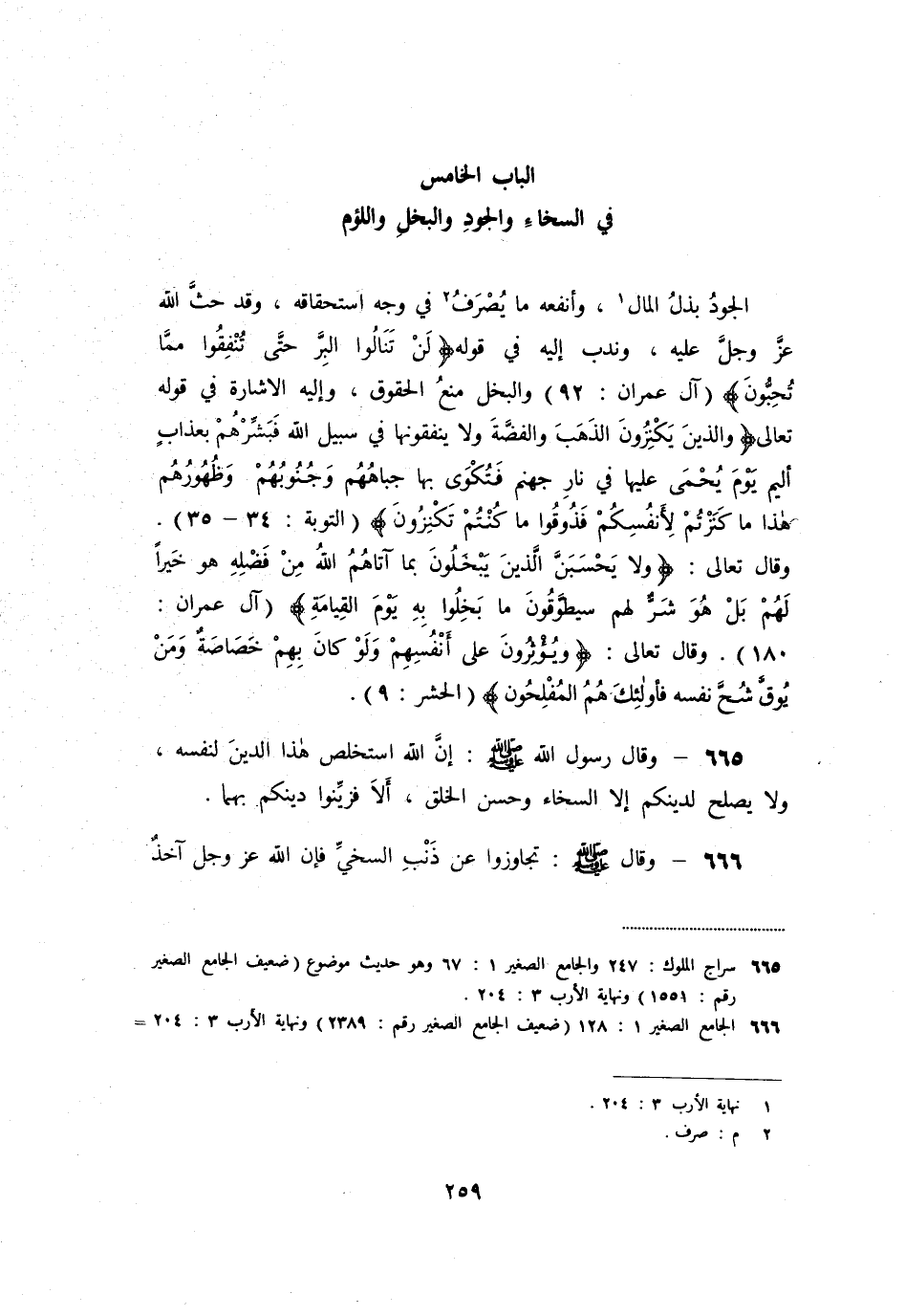 (الباب الخامس في السخاء والجود والبخل واللؤم) الجود بذل المال [1] ، وأنفعه ما يصرف [2] في وجه استحقاقه، وقد حثّ الله عزّ وجلّ عليه، وندب إليه في قوله لَنْ تَنالُوا الْبِرَّ حَتَّى تُنْفِقُوا مِمَّا تُحِبُّونَ
