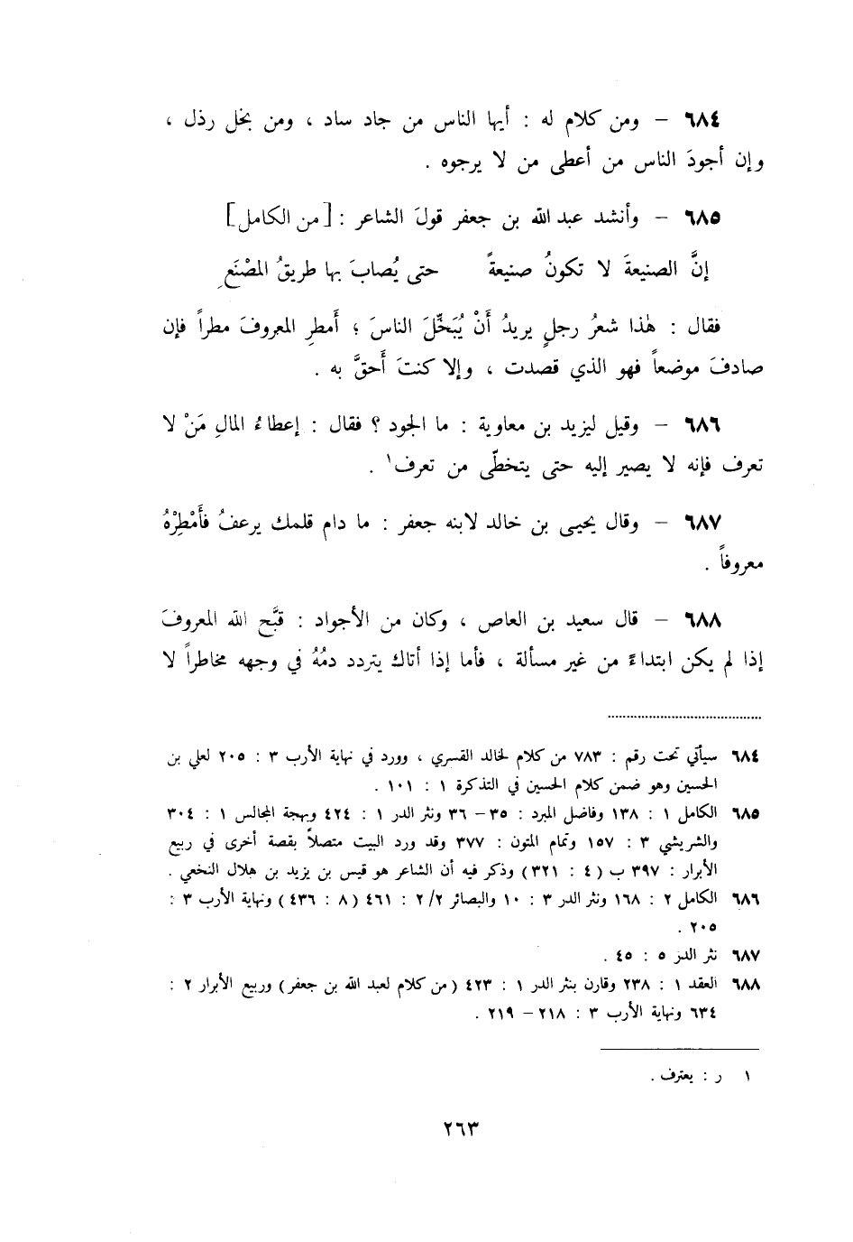 «688» - قال سعيد بن العاص، وكان من الأجواد: قبّح الله المعروف إذا لم يكن ابتداء من غير مسألة، فأما إذا أتاك يتردد دمه في وجهه مخاطرا لا