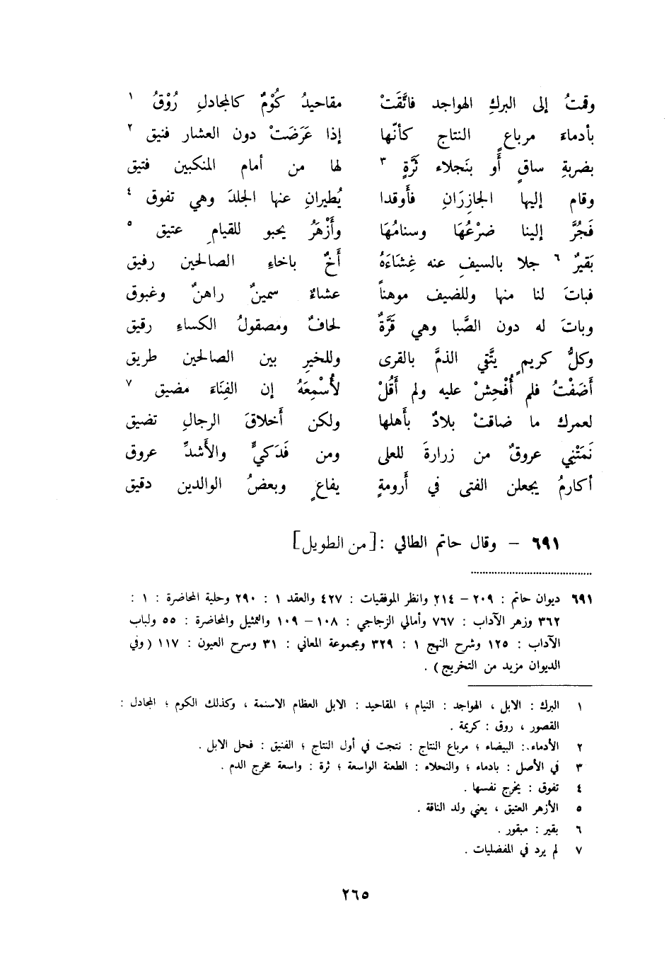 [1] البرك: الابل، الهواجد: النيام؛ المقاحيد: الابل العظام الاسنمة، وكذلك الكوم؛ المجادل: