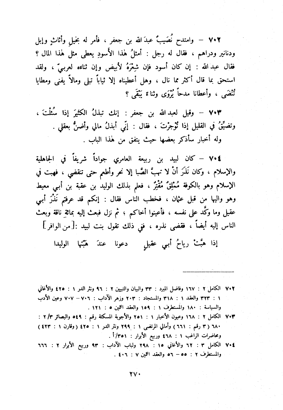 «704» - كان لبيد بن ربيعة العامري جوادا شريفا في الجاهلية والإسلام، وكان نذر أن لا تهبّ الصّبا إلا نحر وأطعم حتى تنقضي، فهبت في الإسلام وهو بالكوفة مملق مقتر، فعلم بذلك الوليد بن عقبة بن أبي معيط وهو واليها من قبل عثمان، فخطب الناس فقال: إنكم قد عرفتم نذر أبي عقيل وما وكّد على نفسه، فأعينوا أخاكم؛ ثم نزل فبعث إليه بمائة ناقة وبعث الناس إليه أيضا، فقضى نذره، ففي ذلك تقول بنت لبيد: [من الوافر]