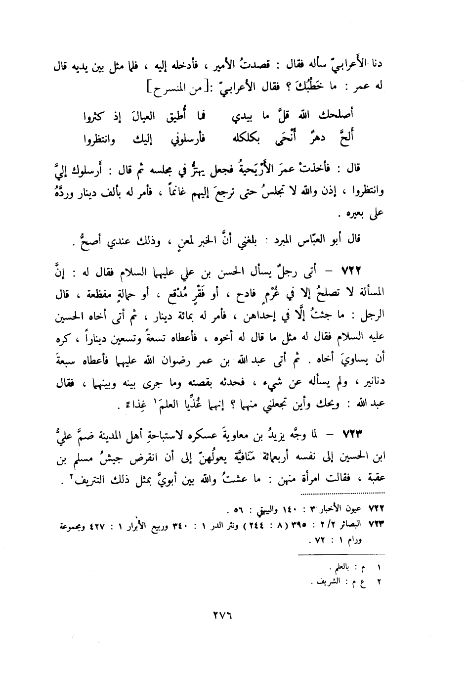 «722» - أتى رجل يسأل الحسن بن علي عليهما السلام فقال له: إنّ المسألة لا تصلح إلا في غرم فادح، أو فقر مدقع، أو حمالة مفظعة، قال الرجل: ما جئت إلّا في إحداهن، فأمر له بمائة دينار، ثم أتى أخاه الحسين عليه السلام فقال له مثل ما قال له أخوه، فأعطاه تسعة وتسعين دينارا، كره أن يساوي أخاه. ثم أتى عبد الله بن عمر رضوان الله عليهما فأعطاه سبعة دنانير، ولم يسأله عن شيء، فحدثه بقصته وما جرى بينه وبينهما، فقال عبد الله: ويحك وأين تجعلني منهما؟ إنهما عذّيا العلم [1] غذاء.