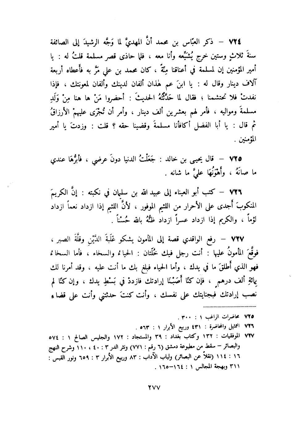 «727» - رفع الواقدي قصة إلى المأمون يشكو غلبة الدّين وقلّة الصبر، فوقّع المأمون عليها: أنت رجل فيك خلّتان: الحياء والسخاء، فأما السخاء فهو الذي أطلق ما في يدك، وأما الحياء فبلغ بك ما أنت عليه، وقد أمرنا لك بمائة ألف درهم، فإن كنّا أصبنا إرادتك فازدد في بسط يدك، وإن كنّا لم نصب إرادتك فبجنايتك على نفسك، وأنت كنت حدثتني وأنت على قضاء
