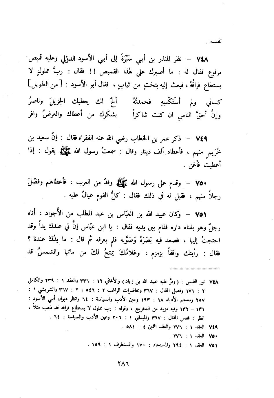 «748» - نظر المنذر بن أبي سبرة إلى أبي الأسود الدؤلي وعليه قميص مرقوع فقال له: ما أصبرك على هذا القميص!! فقال: ربّ مملول لا يستطاع فراقه، فبعث إليه بتخت من ثياب، فقال أبو الأسود: [من الطويل]