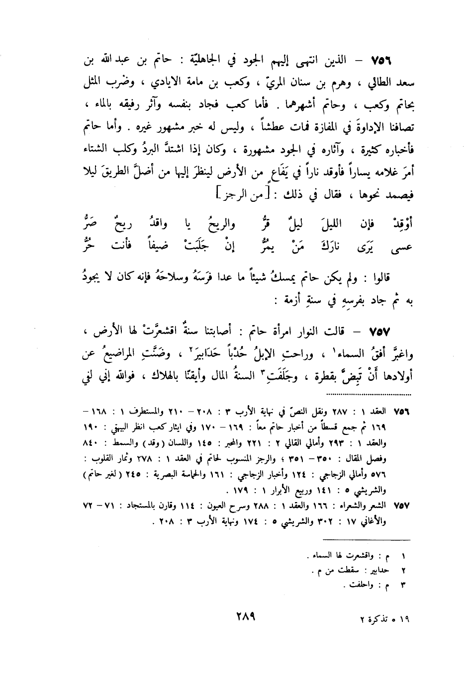 «756» - الذين انتهى إليهم الجود في الجاهليّة: حاتم بن عبد الله بن سعد الطائي، وهرم بن سنان المريّ، وكعب بن مامة الايادي، وضرب المثل بحاتم وكعب، وحاتم أشهرهما. فأما كعب فجاد بنفسه وآثر رفيقه بالماء، تصافنا الإداوة في المفازة فمات عطشا، وليس له خبر مشهور غيره. وأما حاتم فأخباره كثيرة، وآثاره في الجود مشهورة، وكان إذا اشتدّ البرد وكلب الشتاء أمر غلامه يسارا فأوقد نارا في يفاع من الأرض لينظر إليها من أضلّ الطريق ليلا فيصمد نحوها، فقال في ذلك: [من الرجز]