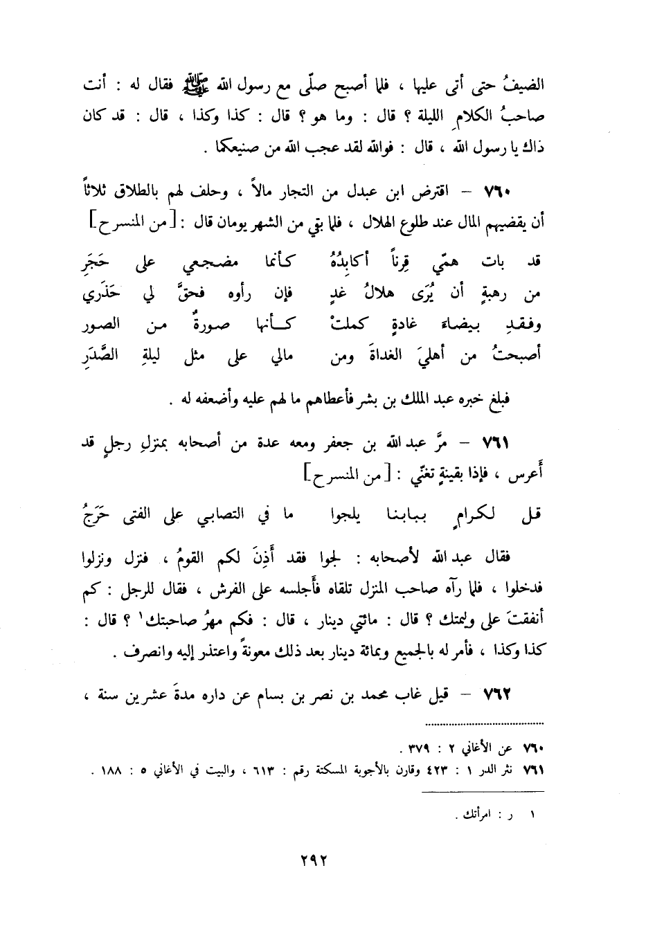 «761» - مرّ عبد الله بن جعفر ومعه عدة من أصحابه بمنزل رجل قد أعرس، فإذا بقينة تغنّي: [من المنسرح]