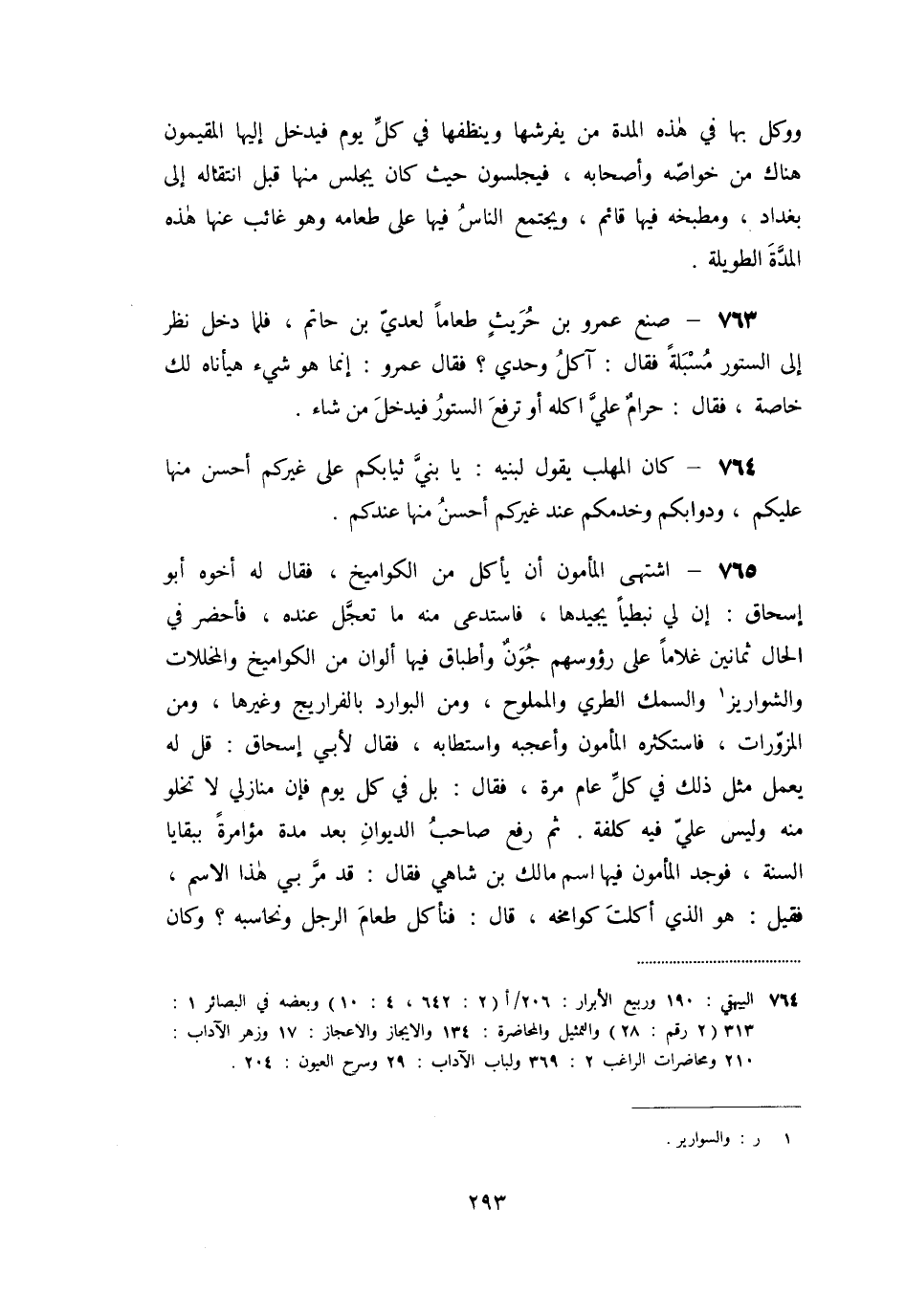 765- اشتهى المأمون أن يأكل من الكواميخ، فقال له أخوه أبو إسحاق: إن لي نبطيا يجيدها، فاستدعى منه ما تعجّل عنده، فأحضر في الحال ثمانين غلاما على رؤوسهم جون وأطباق فيها ألوان من الكواميخ والمخللات والشواريز [1]- والسمك الطري والمملوح، ومن البوارد بالفراريج وغيرها، ومن المزوّرات، فاستكثره المأمون وأعجبه واستطابه، فقال لأبي إسحاق: قل له يعمل مثل ذلك في كلّ عام مرة، فقال: بل في كل يوم فإن منازلي لا تخلو منه وليس عليّ فيه كلفة. ثم رفع صاحب الديوان بعد مدة مؤامرة ببقايا السنة، فوجد المأمون فيها اسم مالك بن شاهي فقال: قد مرّ بي هذا الاسم، فقيل: هو الذي أكلت كوامخه، قال: فنأكل طعام الرجل ونحاسبه؟ وكان