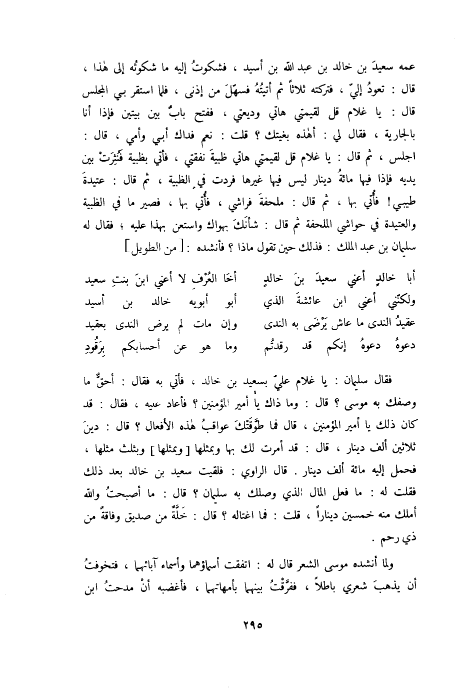 عمه سعيد بن خالد بن عبد الله بن أسيد، فشكوت إليه ما شكوته إلى هذا، قال: تعود إليّ، فتركته ثلاثا ثم أتيته فسهّل من إذنى، فلما استقر بي المجلس قال: يا غلام قل لقيمتي هاتي وديعتي، ففتح باب بين بيتين فإذا أنا بالجارية، فقال لي: أهذه بغيتك؟ قلت: نعم فداك أبي وأمي، قال: