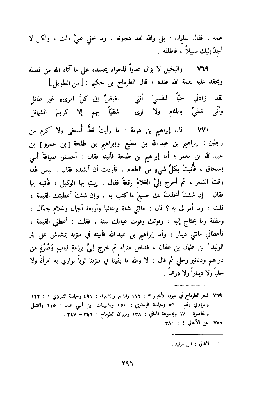 «770» - قال إبراهيم بن هرمة: ما رأيت قطّ أسخى ولا أكرم من رجلين: إبراهيم بن عبد الله بن مطيع وإبراهيم بن طلحة [بن عمرو] بن عبيد الله بن معمر؛ أما إبراهيم بن طلحة فأتيته فقال: أحسنوا ضيافة أبي إسحاق، فأتيت بكلّ شيء من الطعام، فأردت أن أنشده فقال: ليس هذا وقت الشعر، ثم أخرج إليّ الغلام رقعة فقال: إيت بها الوكيل، فأتيته بها فقال: إن شئت أخذت لك جميع ما كتب به، وإن شئت أعطيتك القيمة، قلت: وما أمر لي به؟ قال: مائتي شاة برعائها وأربعة أجمال وغلام جمّال، ومظلة وما يحتاج إليه، وقوتك وقوت عيالك سنة، فقلت: أعطني القيمة، فأعطاني مائتي دينار؛ وأما إبراهيم بن عبد الله فأتيته في منزله بمشاش على بئر الوليد [1] بن عثمان بن عفان، فدخل منزله ثم خرج إليّ برزمة ثياب وصرّة من دراهم ودنانير وحلي ثم قال: لا والله ما بقّينا في منزلنا ثوبا نواري به امرأة ولا حليا ولا دينارا ولا درهما.