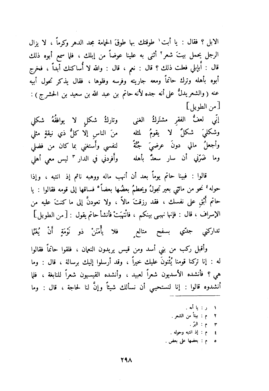 الابل؟ فقال: يا أبت [1] طوقتك بها طوق الحمامة مجد الدهر وكرما، لا يزال الرجل يحمل بيت شعر [2] أثنى به علينا عوضا من إبلك، فلما سمع أبوه ذلك قال: أبإبلي فعلت ذلك؟ قال: نعم، قال: والله لا أساكنك أبدا، فخرج أبوه بأهله وترك حاتما ومعه جاريته وفرسه وفلوها، فقال يذكر تحول أبيه عنه (والشعر يدلّ على أنه جده لأنه حاتم بن عبد الله بن سعيد بن الحشرج) :