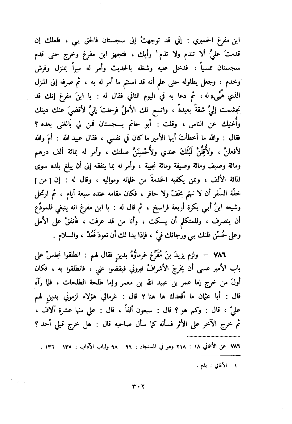 «786» - ولزم يزيد بن مفرّغ غرماؤه بدين فقال لهم: انطلقوا نجلس على باب الأمير عسى أن يخرج الأشراف فيروني فيقضوا عني، فانطلقوا به، فكان أول من خرج إما عمر بن عبيد الله بن معمر وإما طلحة الطلحات، فلما رآه قال: أبا عثمان ما أقعدك ها هنا؟ قال: غرمائي هؤلاء لزموني بدين لهم عليّ، قال: وكم هو؟ قال: سبعون ألفا، قال: علي منها عشرة آلاف، ثم خرج الآخر على الأثر فسأله كما سأل صاحبه قال: هل خرج قبلي أحد؟