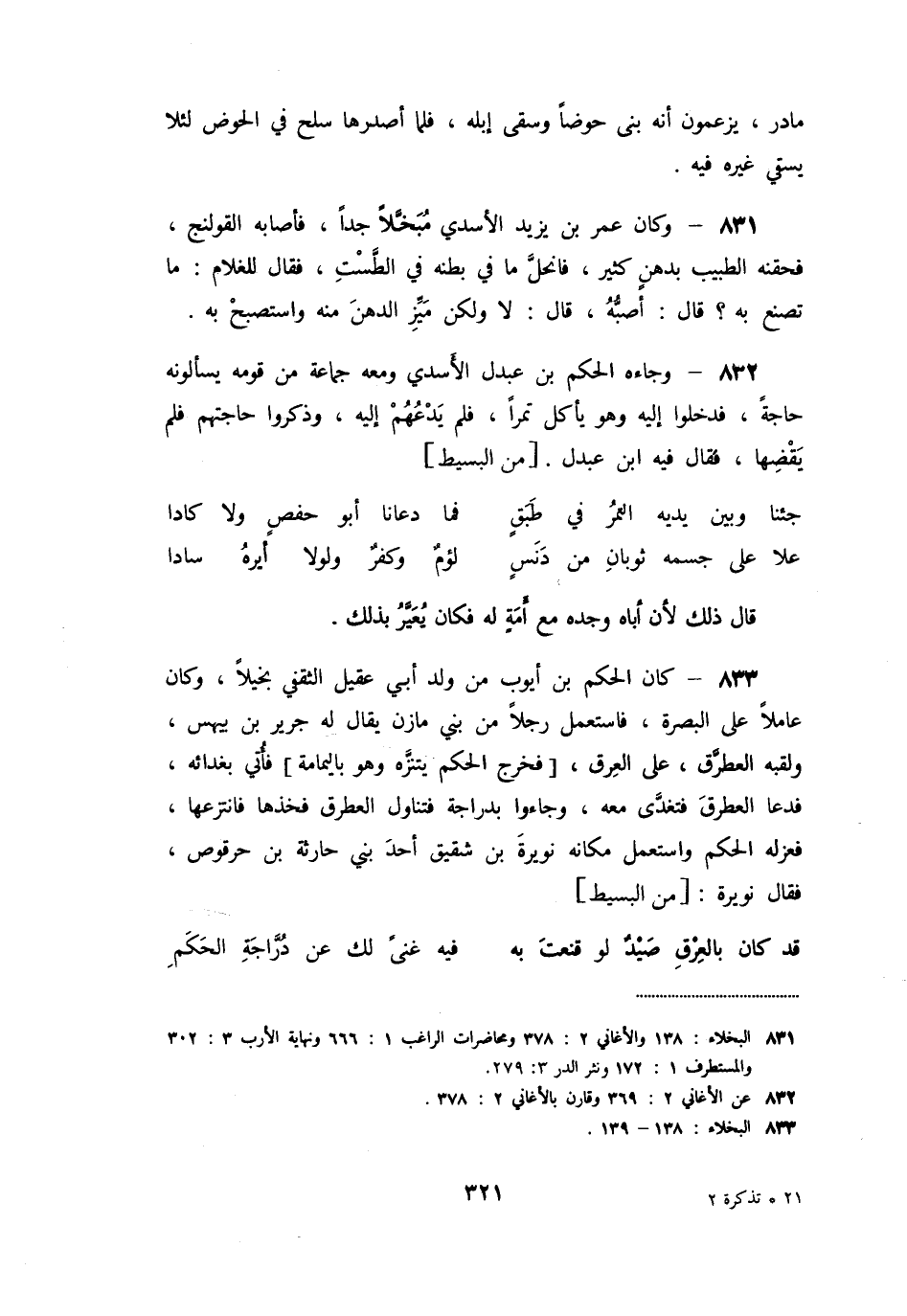 «831» - وكان عمر بن يزيد الأسدي مبخّلا جدا، فأصابه القولنج، فحقنه الطبيب بدهن كثير، فانحلّ ما في بطنه في الطّست، فقال للغلام: ما تصنع به؟ قال: أصبّه، قال: لا ولكن ميّز الدهن منه واستصبح به.