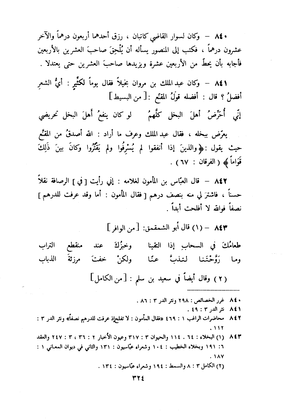 «841» - وكان عبد الملك بن مروان بخيلا فقال يوما لكثّير: أيّ الشعر أفضل؟ قال: أفضله قول المقنّع: [من البسيط]