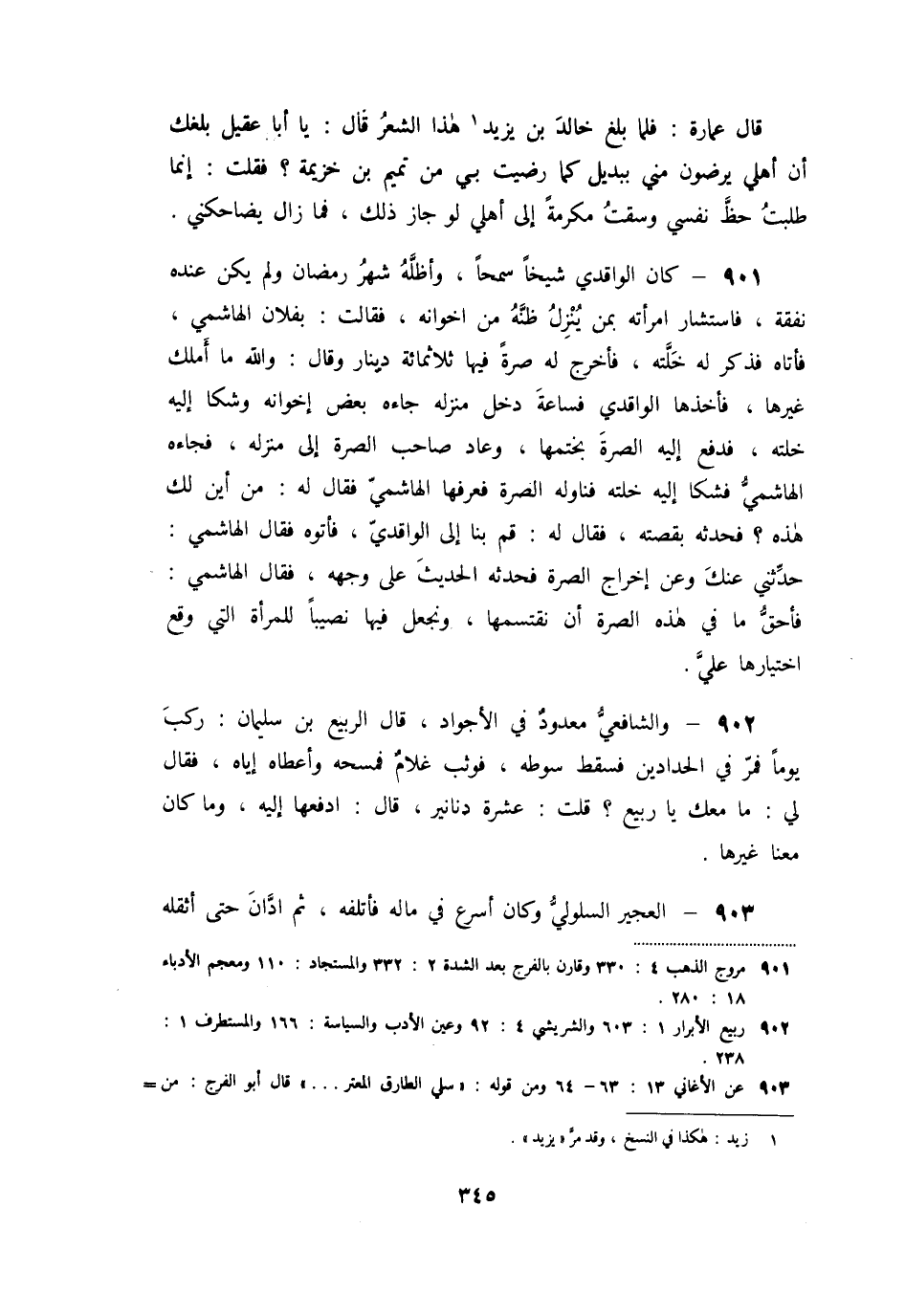 «901» - كان الواقدي شيخا سمحا، وأظلّه شهر رمضان ولم يكن عنده نفقة، فاستشار امرأته بمن ينزل ظنّه من اخوانه، فقالت: بفلان الهاشمي، فأتاه فذكر له خلّته، فأخرج له صرة فيها ثلاثمائة دينار وقال: والله ما أملك غيرها، فأخذها الواقدي فساعة دخل منزله جاءه بعض إخوانه وشكا إليه خلته، فدفع إليه الصرة بختمها، وعاد صاحب الصرة إلى منزله، فجاءه الهاشميّ فشكا إليه خلته فناوله الصرة فعرفها الهاشميّ فقال له: من أين لك هذه؟ فحدثه بقصته، فقال له: قم بنا إلى الواقديّ، فأتوه فقال الهاشمي: