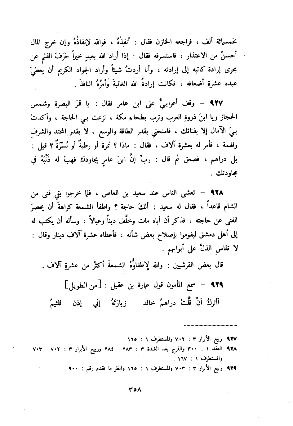 «927» - وقف أعرابيّ على ابن عامر فقال: يا قمر البصرة وشمس الحجاز ويا ابن ذروة العرب وترب بطحاء مكة، نزعت بي الحاجة، وأكدت بي الآمال إلا بفنائك، فامنحني بقدر الطاقة والوسع، لا بقدر المحتد والشرف والهمة، فأمر له بعشرة آلاف، فقال: ماذا؟ تمرة أو رطبة أو بسرة؟ قيل: