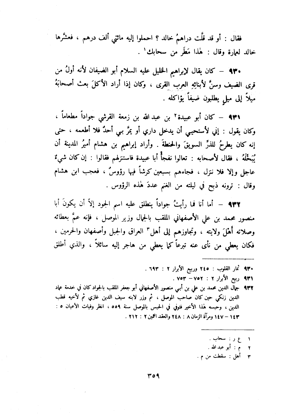 «932» - أما أنا فما رأيت جوادا ينطلق عليه اسم الجود إلّا أن يكون أبا منصور محمد بن علي الأصفهاني الملقب بالجمال وزير الموصل، فإنه عمّ بعطائه وصلاته أهل ولايته، وتجاوزهم إلى أهل [3] العراق والجبل وأصفهان والحرمين، فكان يعطي من نأى عنه تبرعا كما يعطي من هاجر إليه سائلا، والذي أطلق
