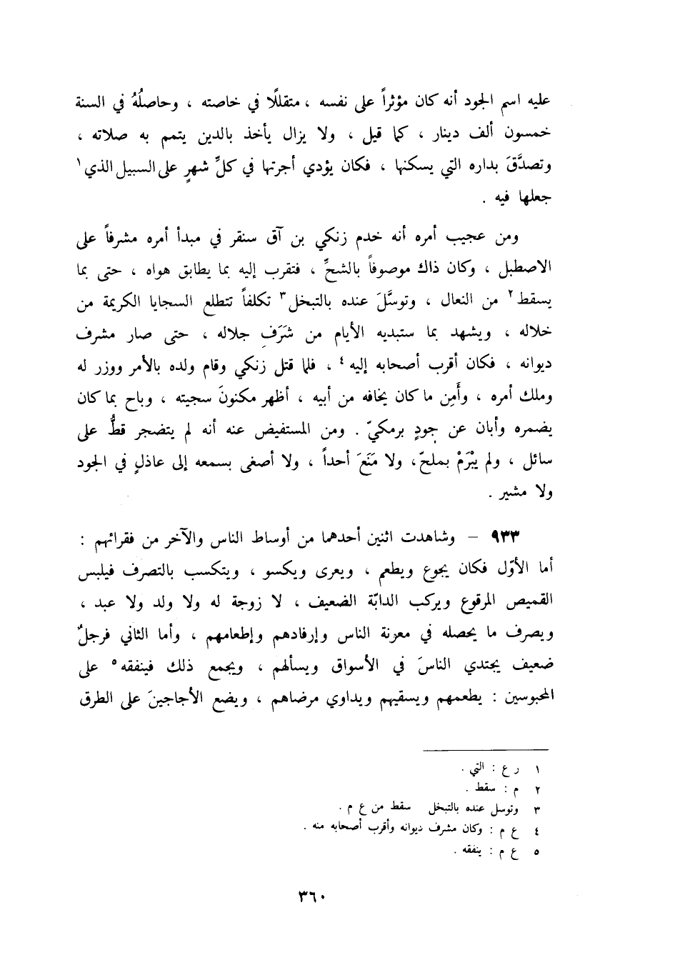 ومن عجيب أمره أنه خدم زنكي بن آق سنقر في مبدأ أمره مشرفا على الاصطبل، وكان ذاك موصوفا بالشحّ، فتقرب إليه بما يطابق هواه، حتى بما يسقط [2] من النعال، وتوسّل عنده بالتبخل [3] تكلفا تتطلع السجايا الكريمة من خلاله، ويشهد بما ستبديه الأيام من شرف جلاله، حتى صار مشرف ديوانه، فكان أقرب أصحابه إليه [4] ، فلما قتل زنكي وقام ولده بالأمر ووزر له وملك أمره، وأمن ما كان يخافه من أبيه، أظهر مكنون سجيته، وباح بما كان يضمره وأبان عن جود برمكيّ. ومن المستفيض عنه أنه لم يتضجر قطّ على سائل، ولم يبرم بملحّ، ولا منع أحدا، ولا أصغى بسمعه إلى عاذل في الجود ولا مشير.
