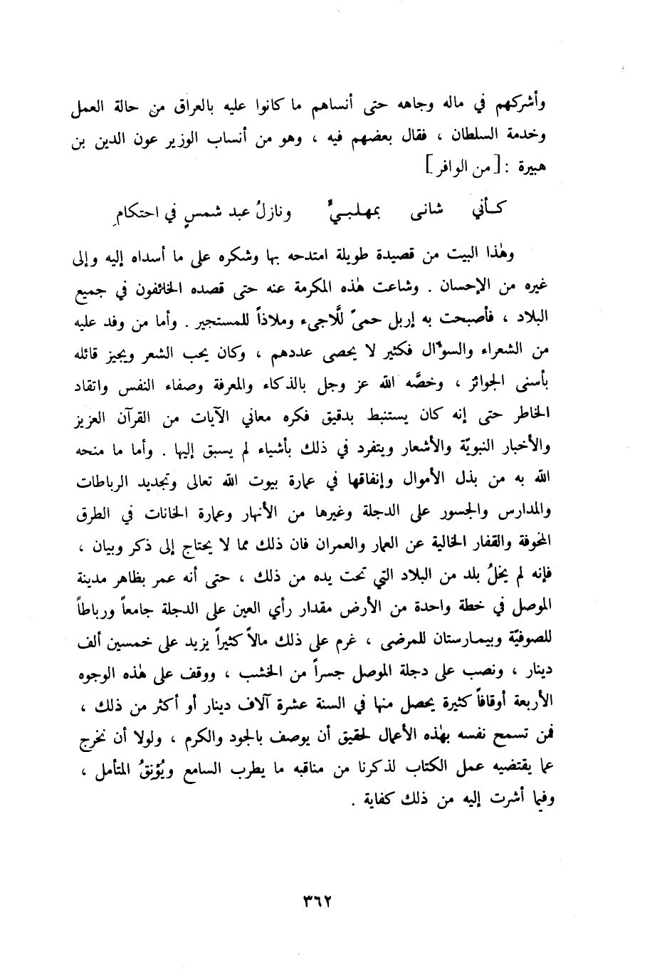 وهذا البيت من قصيدة طويلة امتدحه بها وشكره على ما أسداه إليه وإلى غيره من الإحسان. وشاعت هذه المكرمة عنه حتى قصده الخائفون في جميع البلاد، فأصبحت به إربل حمى لّلاجىء وملاذا للمستجير. وأما من وفد عليه من الشعراء والسؤال فكثير لا يحصى عددهم، وكان يحب الشعر ويجيز قائله بأسنى الجوائز، وخصّه الله عز وجل بالذكاء والمعرفة وصفاء النفس واتقاد الخاطر حتى إنه كان يستنبط بدقيق فكره معاني الآيات من القرآن العزيز والأخبار النبويّة والأشعار ويتفرد في ذلك بأشياء لم يسبق إليها. وأما ما منحه الله به من بذل الأموال وإنفاقها في عمارة بيوت الله تعالى وتجديد الرباطات والمدارس والجسور على الدجلة وغيرها من الأنهار وعمارة الخانات في الطرق المخوفة والقفار الخالية عن العمار والعمران فان ذلك مما لا يحتاج إلى ذكر وبيان، فإنه لم يخل بلد من البلاد التي تحت يده من ذلك، حتى أنه عمر بظاهر مدينة الموصل في خطة واحدة من الأرض مقدار رأي العين على الدجلة جامعا ورباطا للصوفيّة وبيمارستان للمرضى، غرم على ذلك مالا كثيرا يزيد على خمسين ألف دينار، ونصب على دجلة الموصل جسرا من الخشب، ووقف على هذه الوجوه الأربعة أوقافا كثيرة يحصل منها في السنة عشرة آلاف دينار أو أكثر من ذلك، فمن تسمح نفسه بهذه الأعمال لحقيق أن يوصف بالجود والكرم، ولولا أن نخرج عما يقتضيه عمل الكتاب لذكرنا من مناقبه ما يطرب السامع ويؤنق المتأمل، وفيما أشرت إليه من ذلك كفاية.