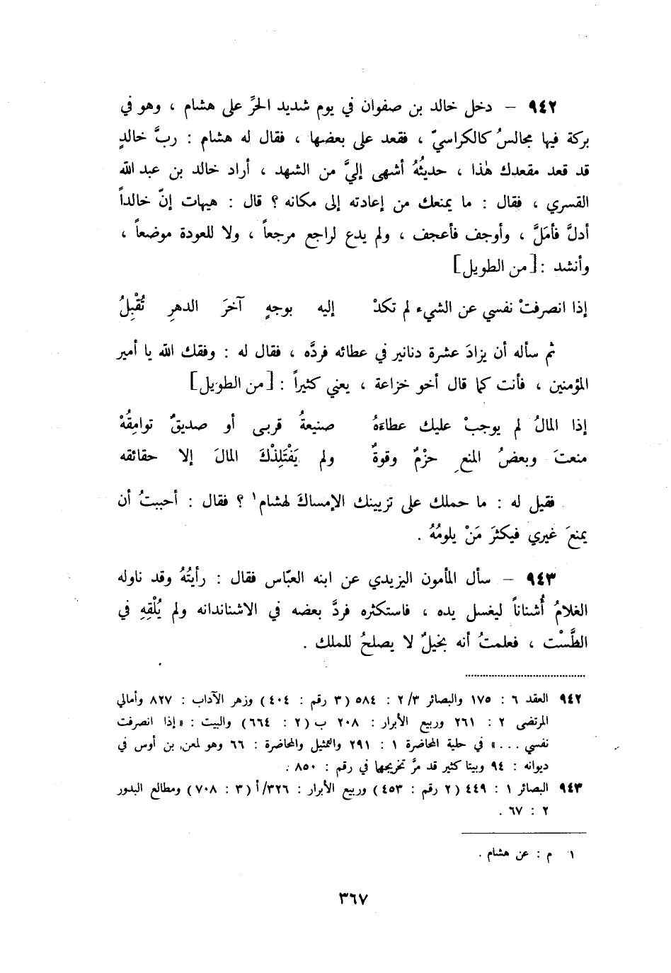 «942» - دخل خالد بن صفوان في يوم شديد الحرّ على هشام، وهو في بركة فيها مجالس كالكراسيّ، فقعد على بعضها، فقال له هشام: ربّ خالد قد قعد مقعدك هذا، حديثه أشهى إليّ من الشهد، أراد خالد بن عبد الله القسري، فقال: ما يمنعك من إعادته إلى مكانه؟ قال: هيهات إنّ خالدا أدلّ فأملّ، وأوجف فأعجف، ولم يدع لراجع مرجعا، ولا للعودة موضعا، وأنشد: [من الطويل]